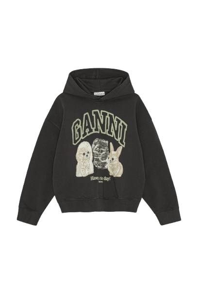 Felpa nera Animal Print di Ganni in cotone con cappuccio con coulisse, maniche lunghe stampa frontale e orlo dritto.