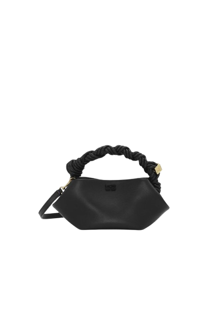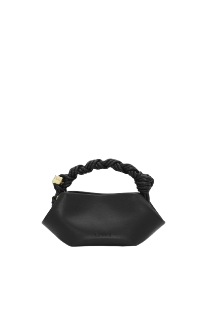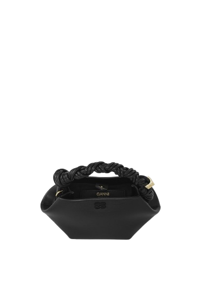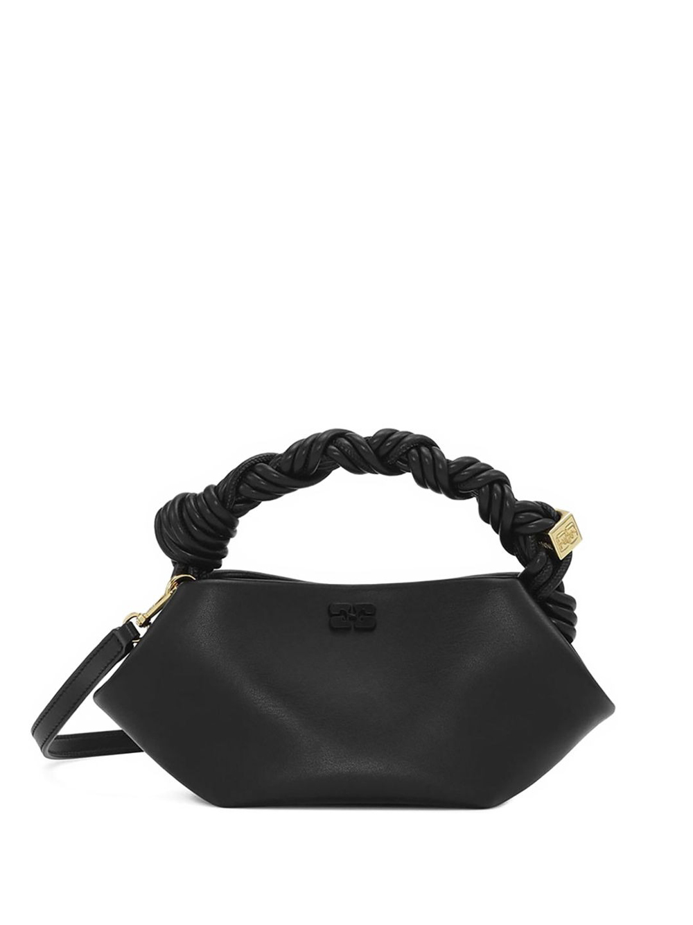 Borsa nera Bou Mini di Ganni in pelle con manico intrecciato, dettagli color oro, placca con logo, chiusura magnetica, tracolla regolabile e rimovibile.