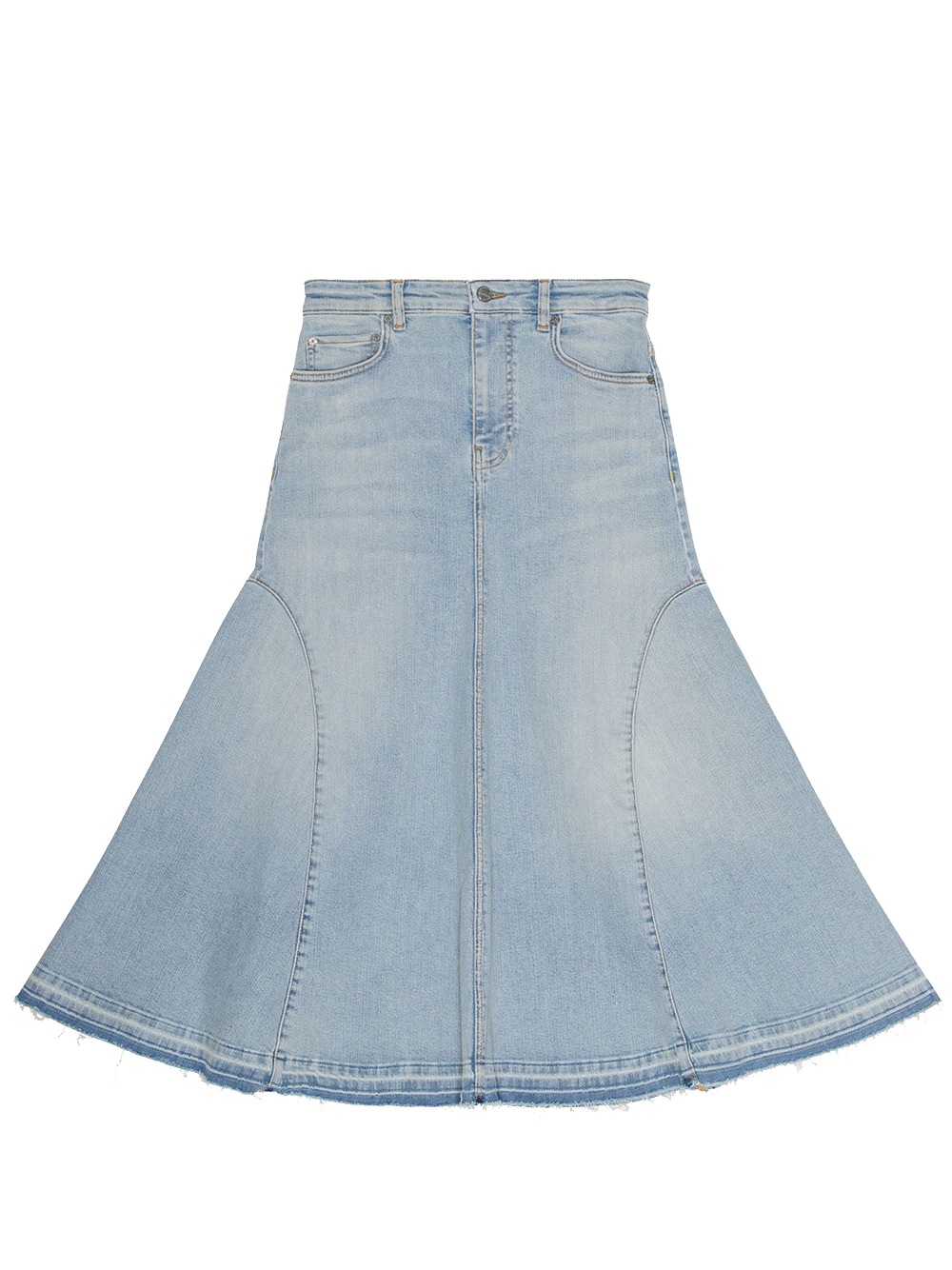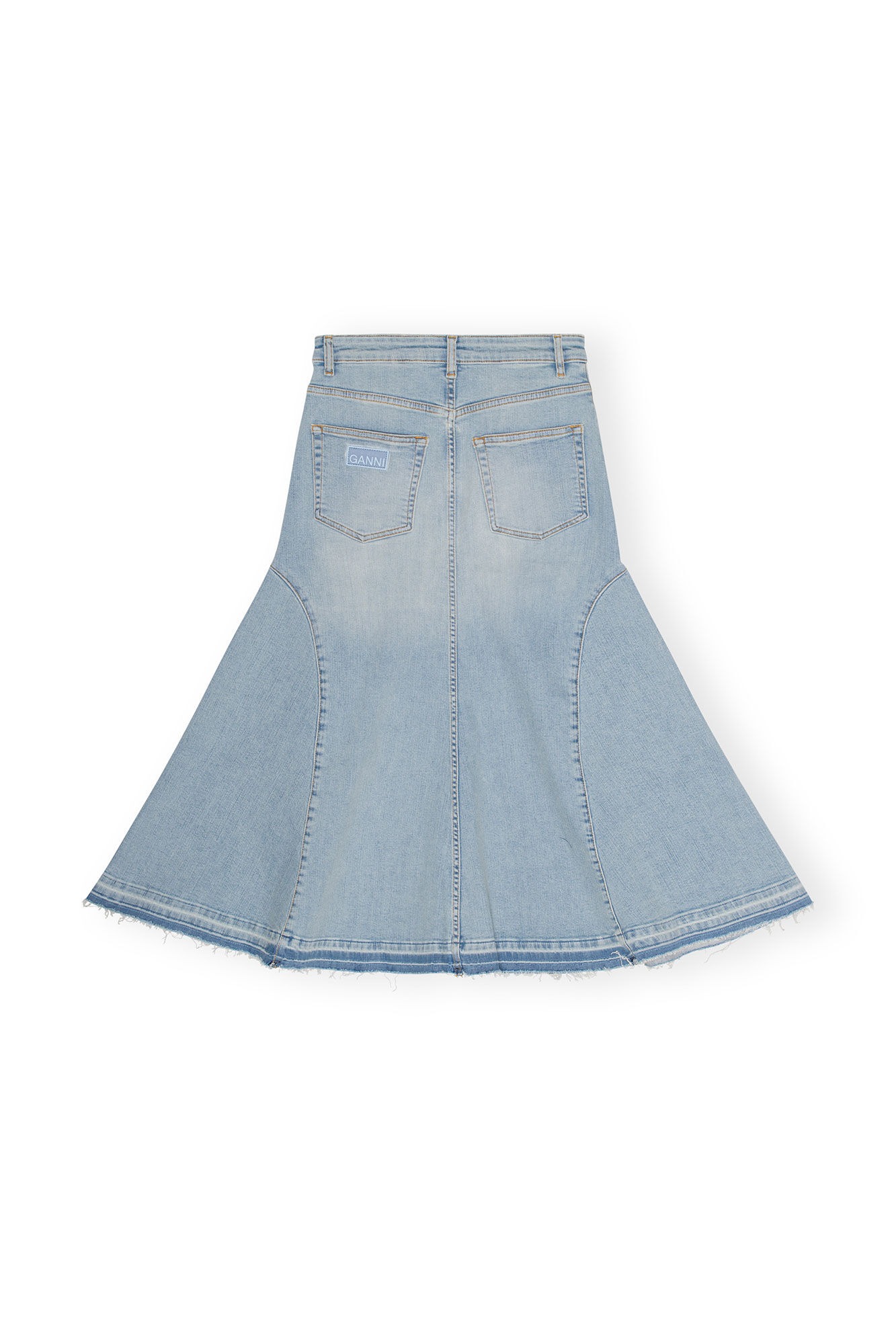Gonna mid blu Midi di Ganni in cotone con design 5 tasche, vita con passanti, chiusura con bottone e zip nascosta e design svasato.