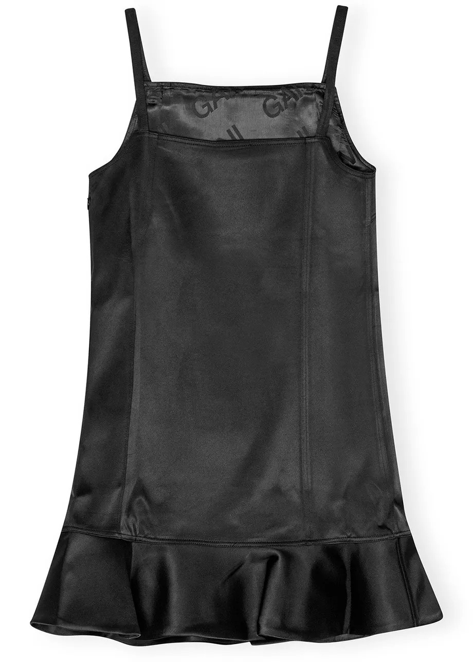 Mini abito nero Duchesse satin di Ganni in poliestere con scollo quadrato, bretelle sottili, lunghezza al ginocchio e orlo increspato.
