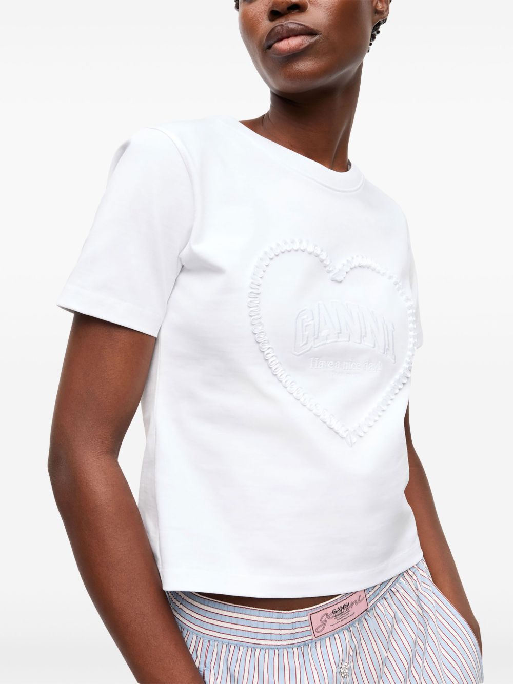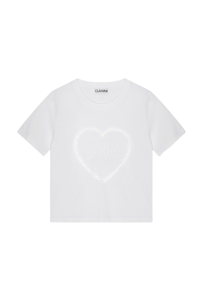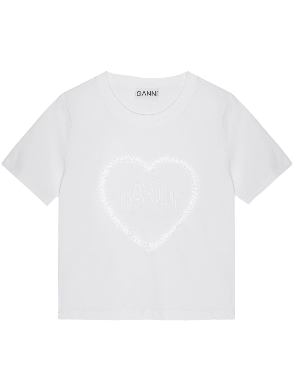 T-shirt bianca Heart di Ganni in cotone con girocollo, maniche corte, stampa frontale e orlo dritto.