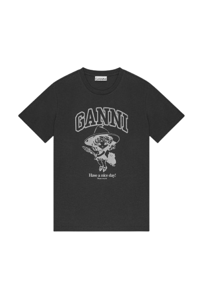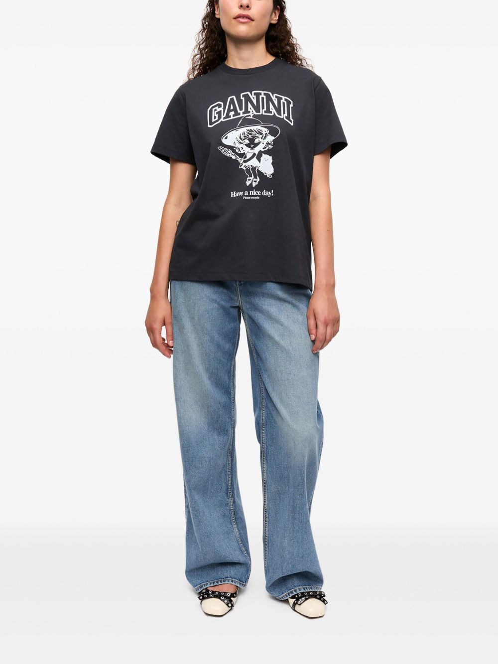 T-shirt nera di Ganni in cotone con girocollo, maniche corte, stampa frontale e sul retro e orlo dritto.