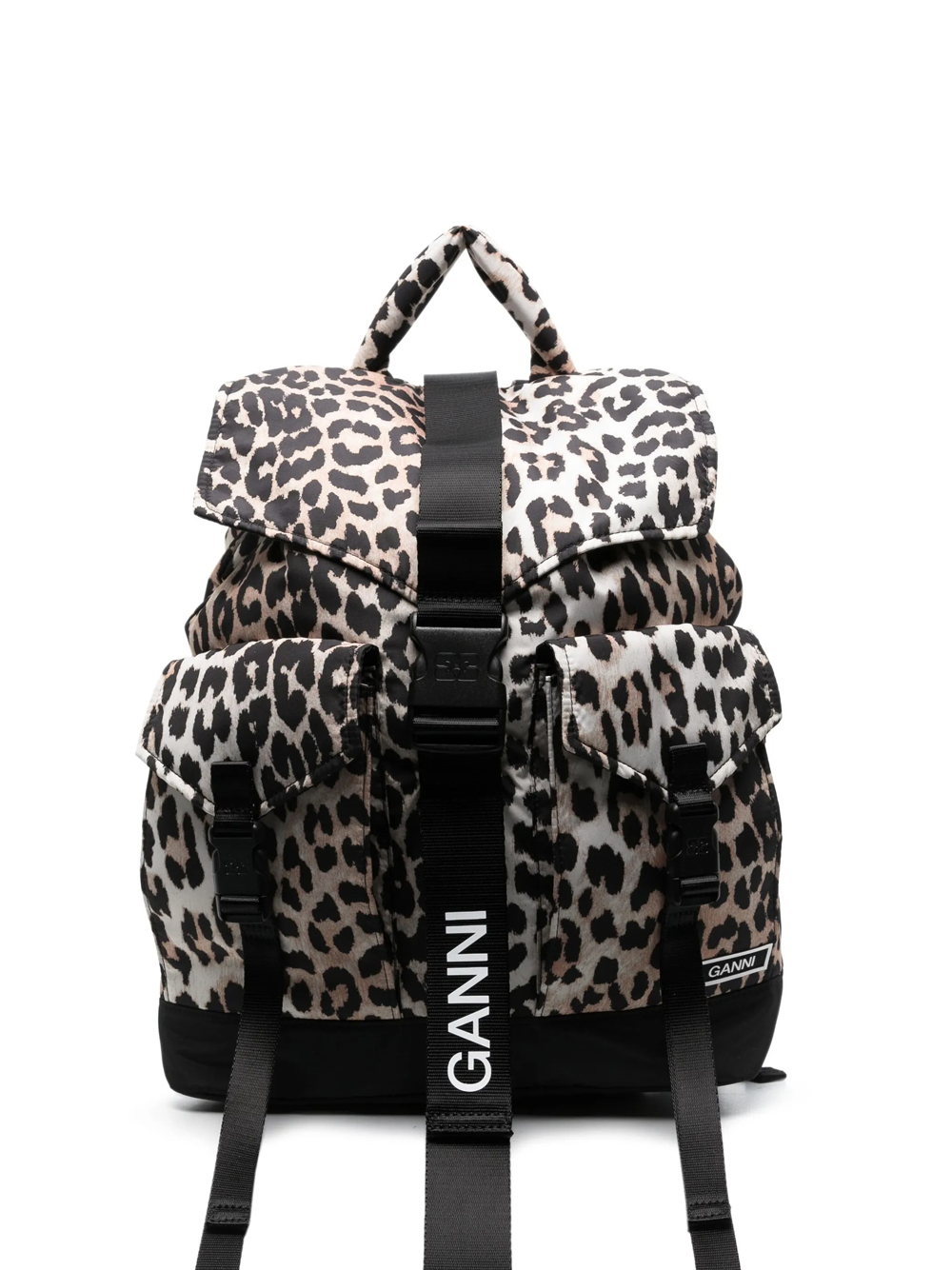 Zaino leopardato Tech di Ganni in poliestere con manico piatto, chiusura con pattina frontale, due asche frontali con patta e spallacci regolabili.