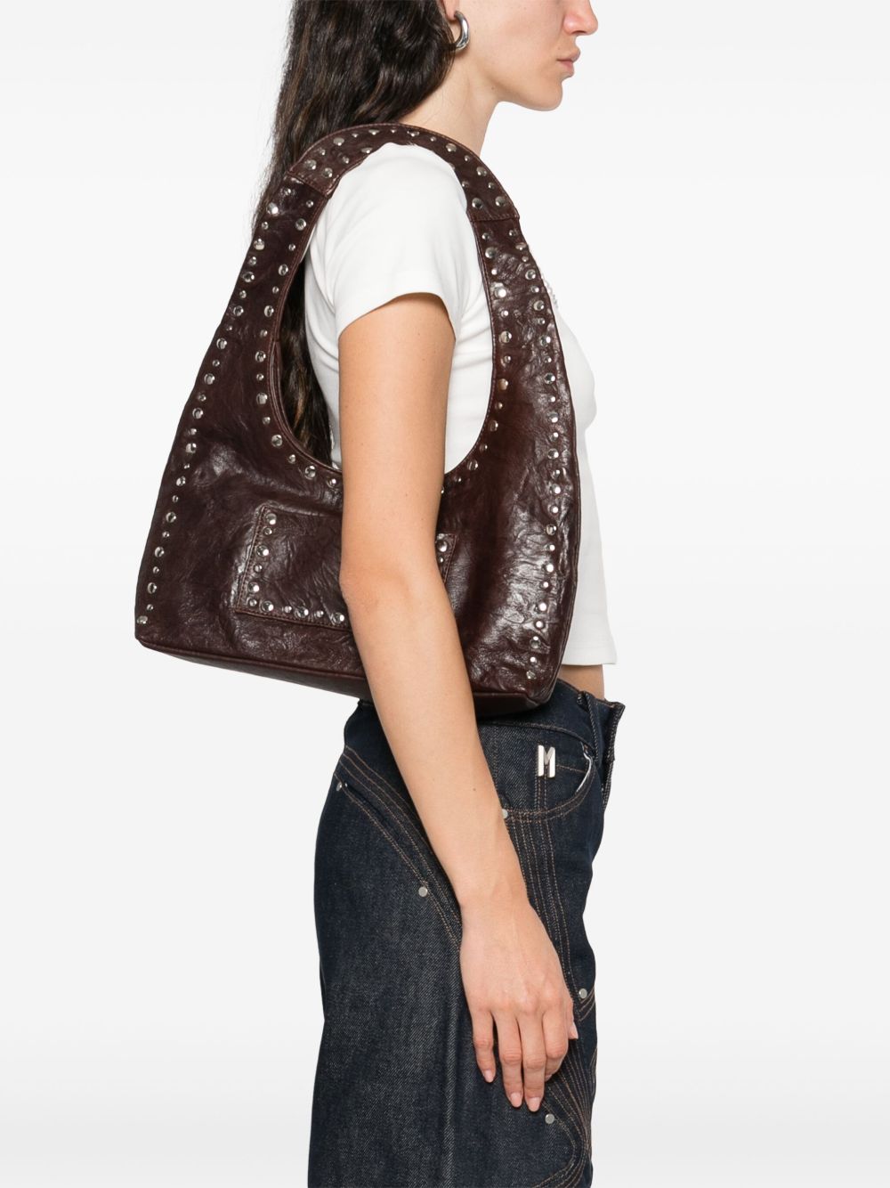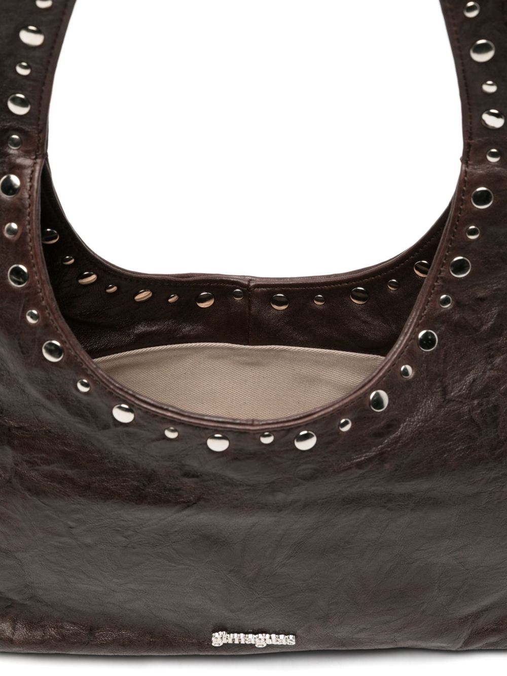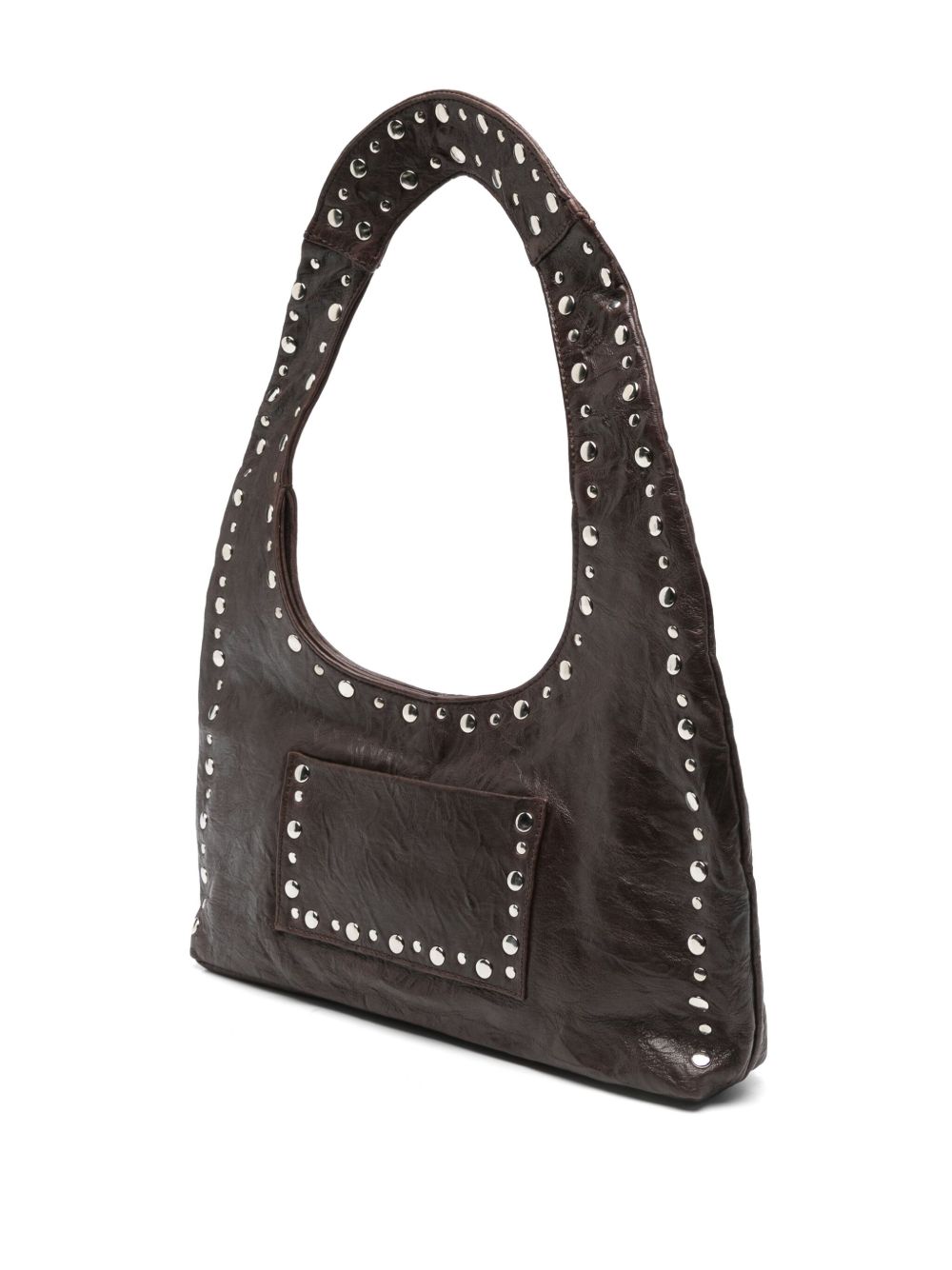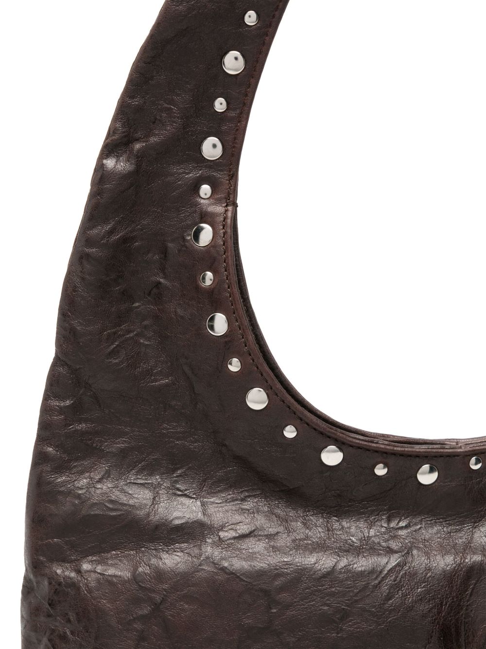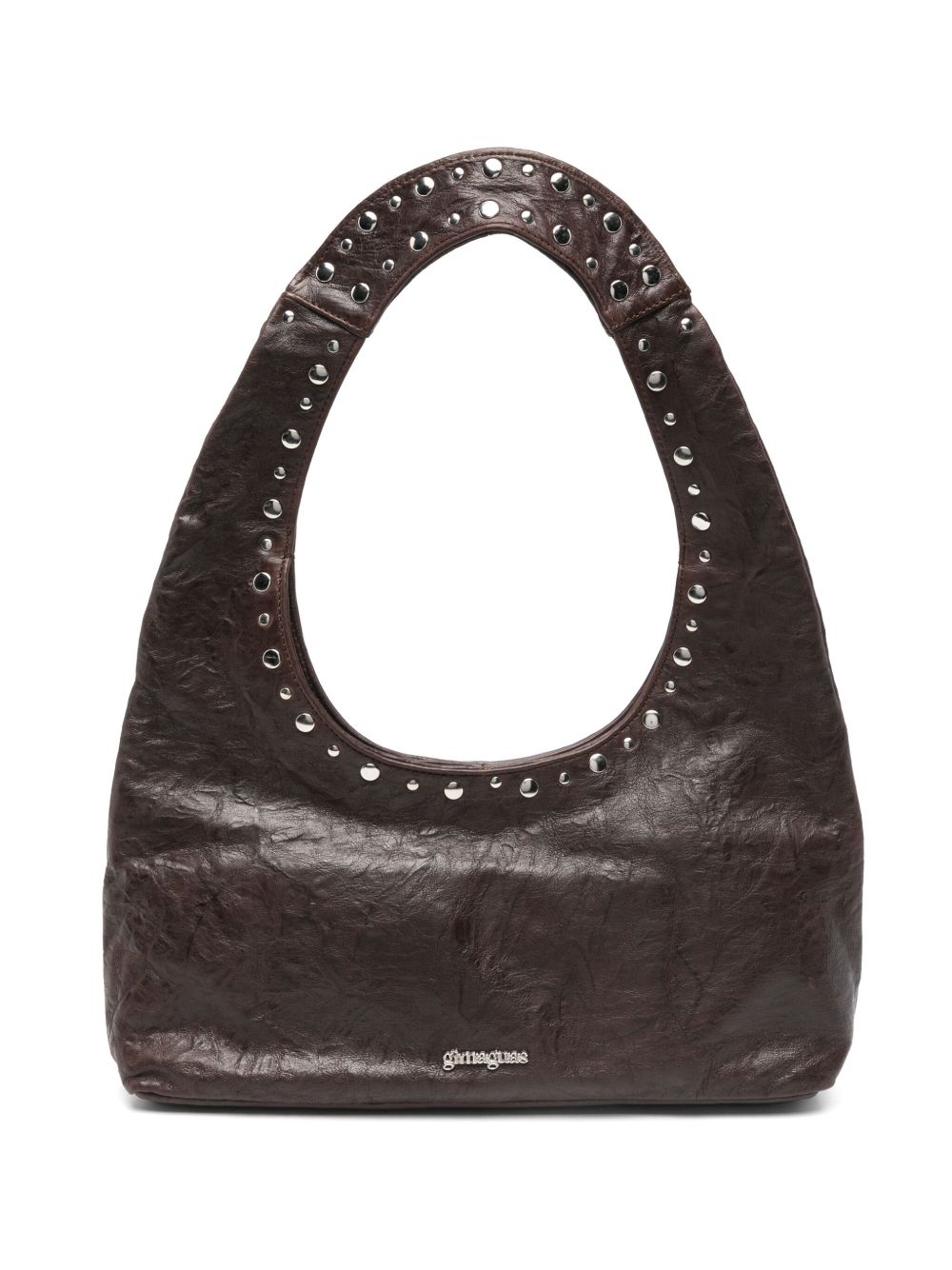 borsa marrone Franca di Gimaguas in pelle con borchie metalliche, tasca interna e una esterna, chiusura magnetica e logo Gimaguas metallico sul retro.