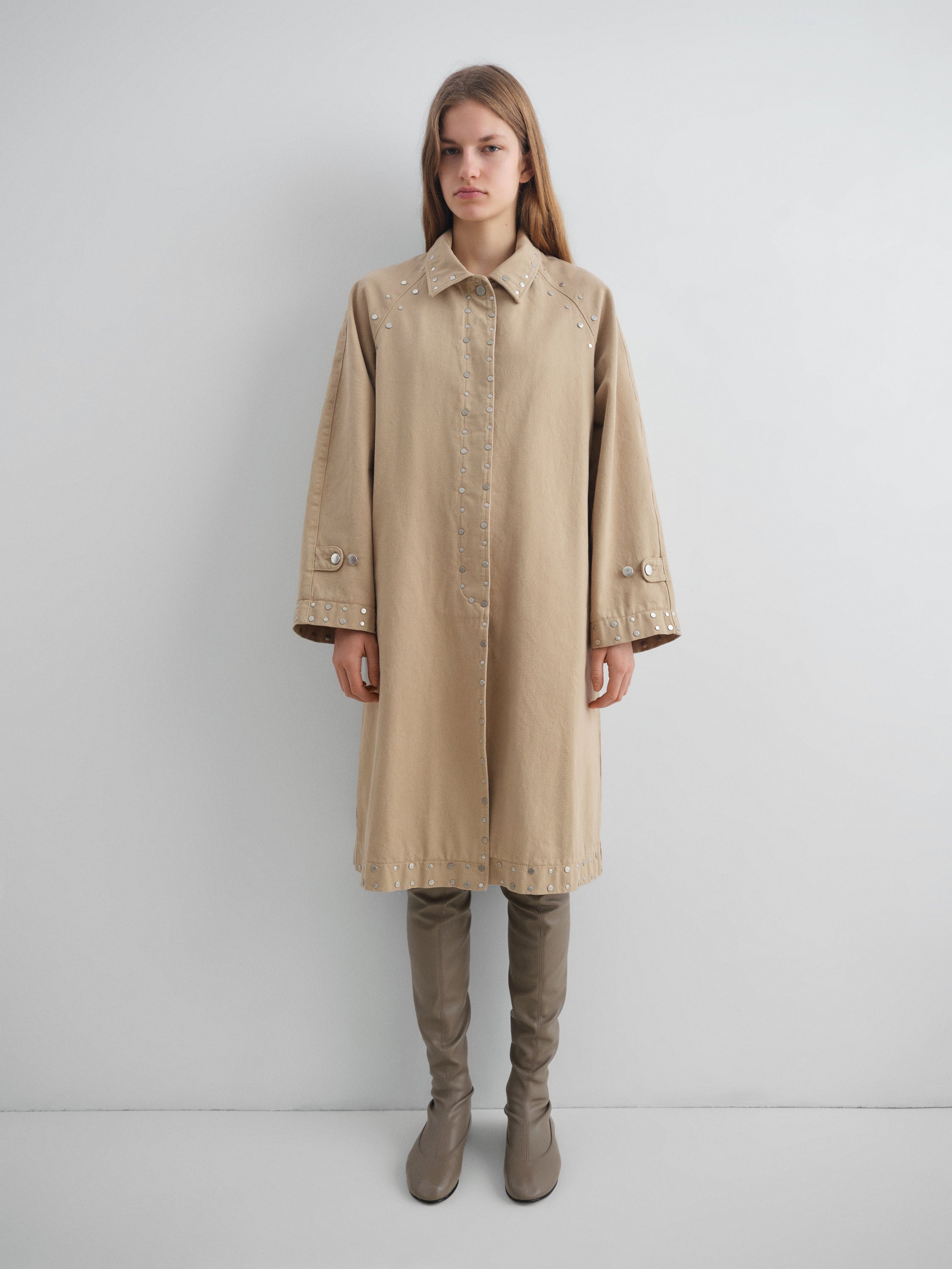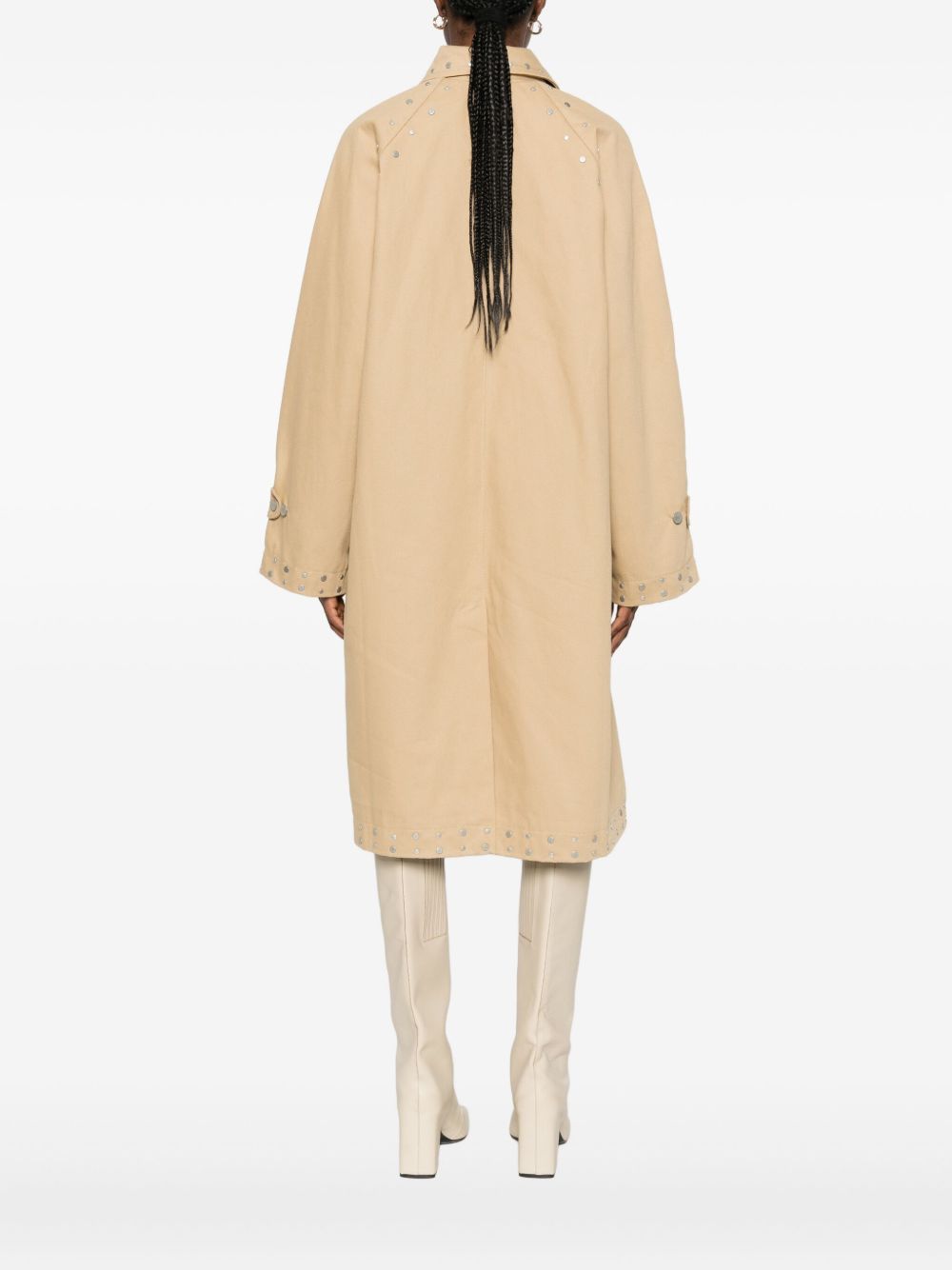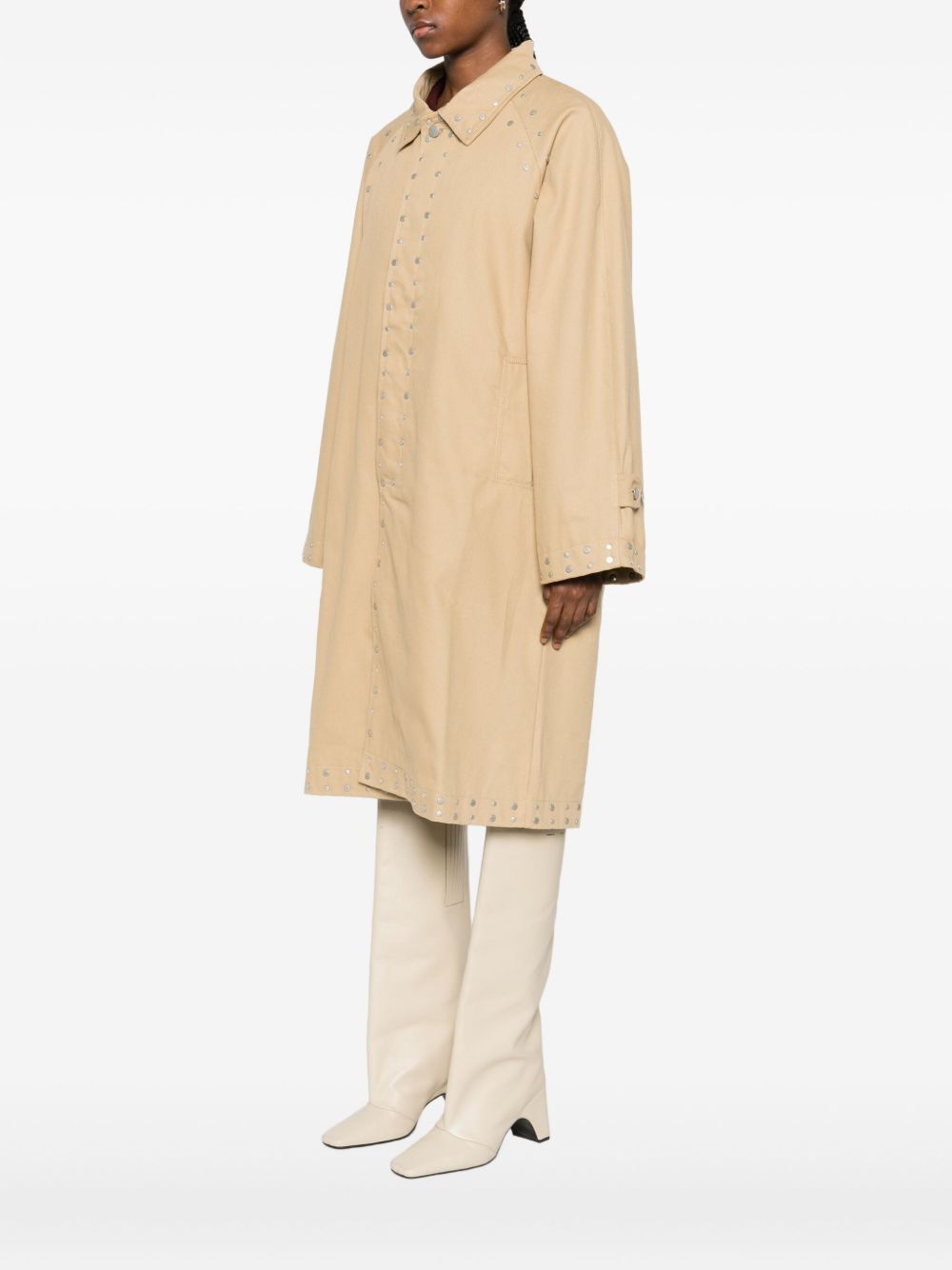 Cappotto beige Tina di Gimaguas in cotone con colletto classico chiusura frontale con bottoni, dettaglio borchie e orlo dritto.
