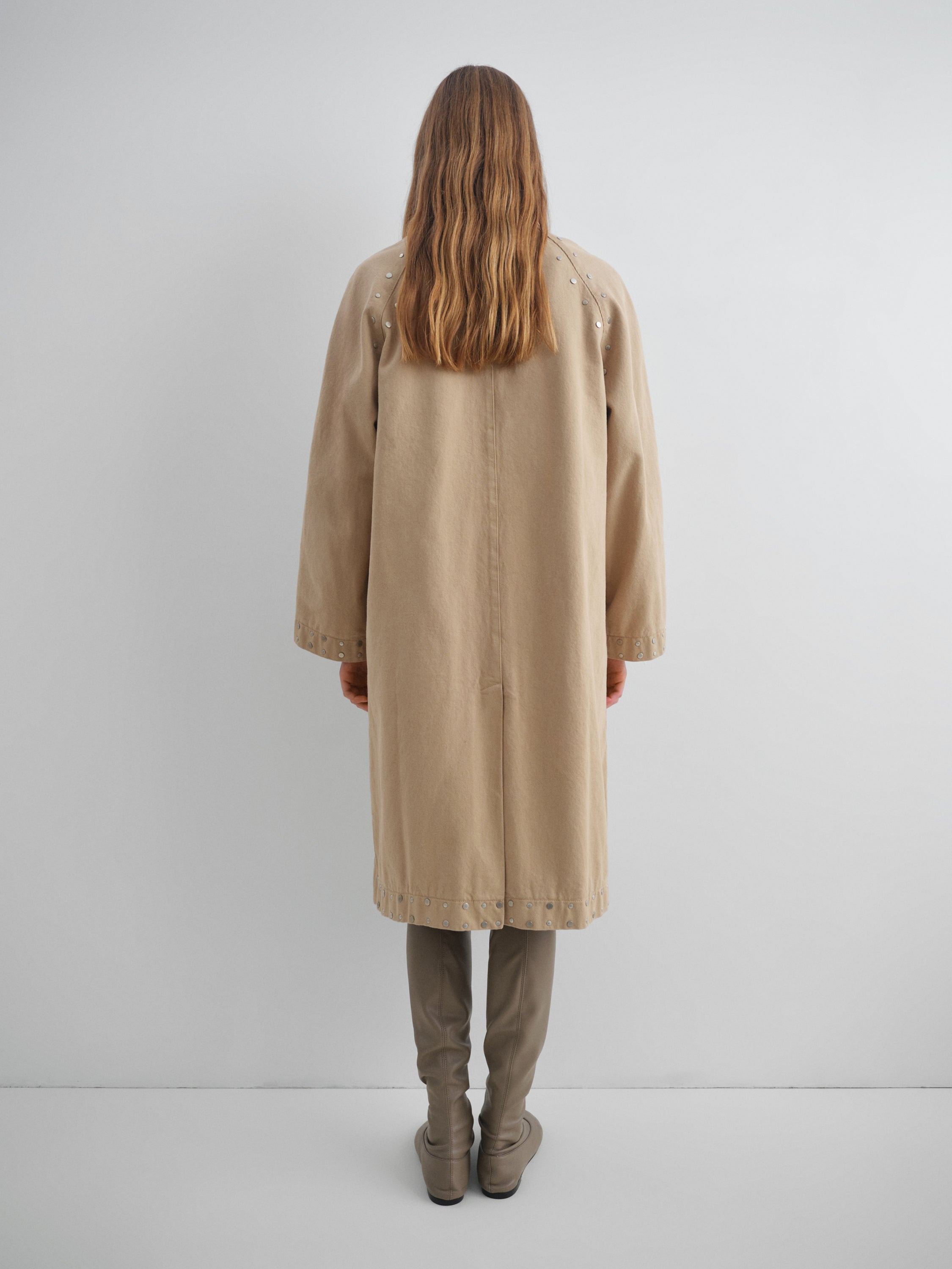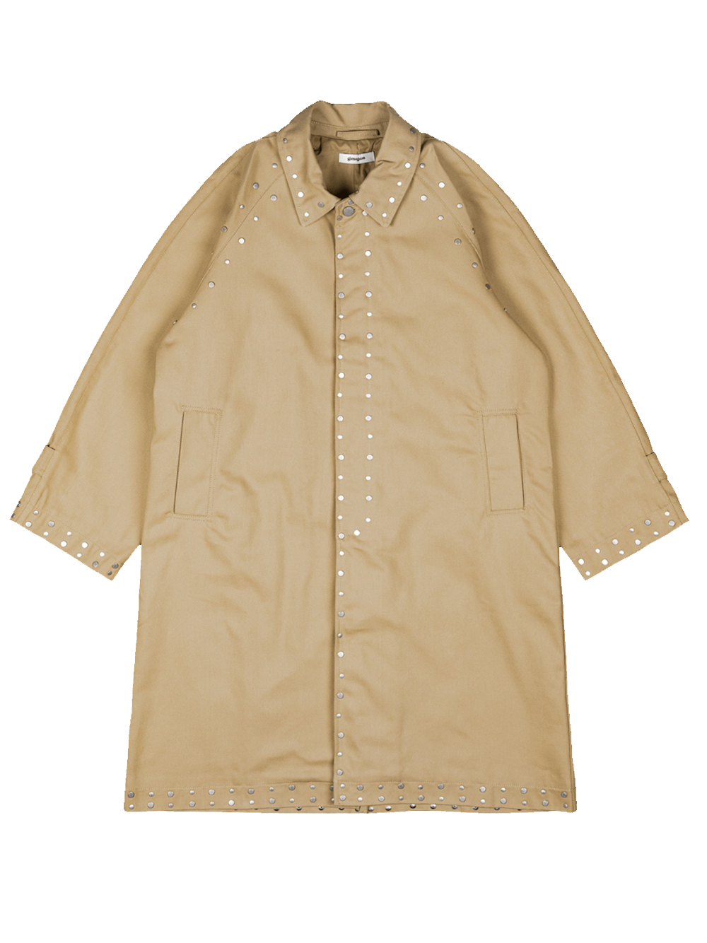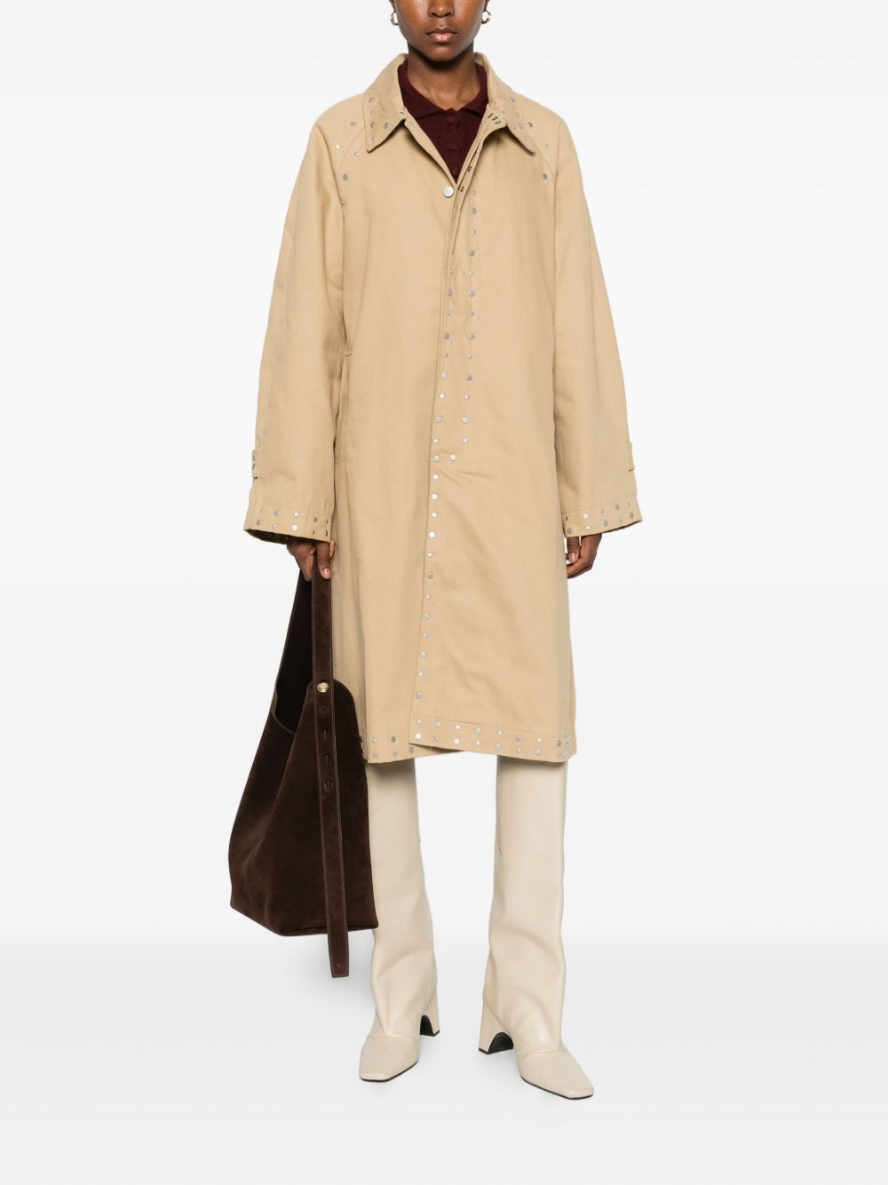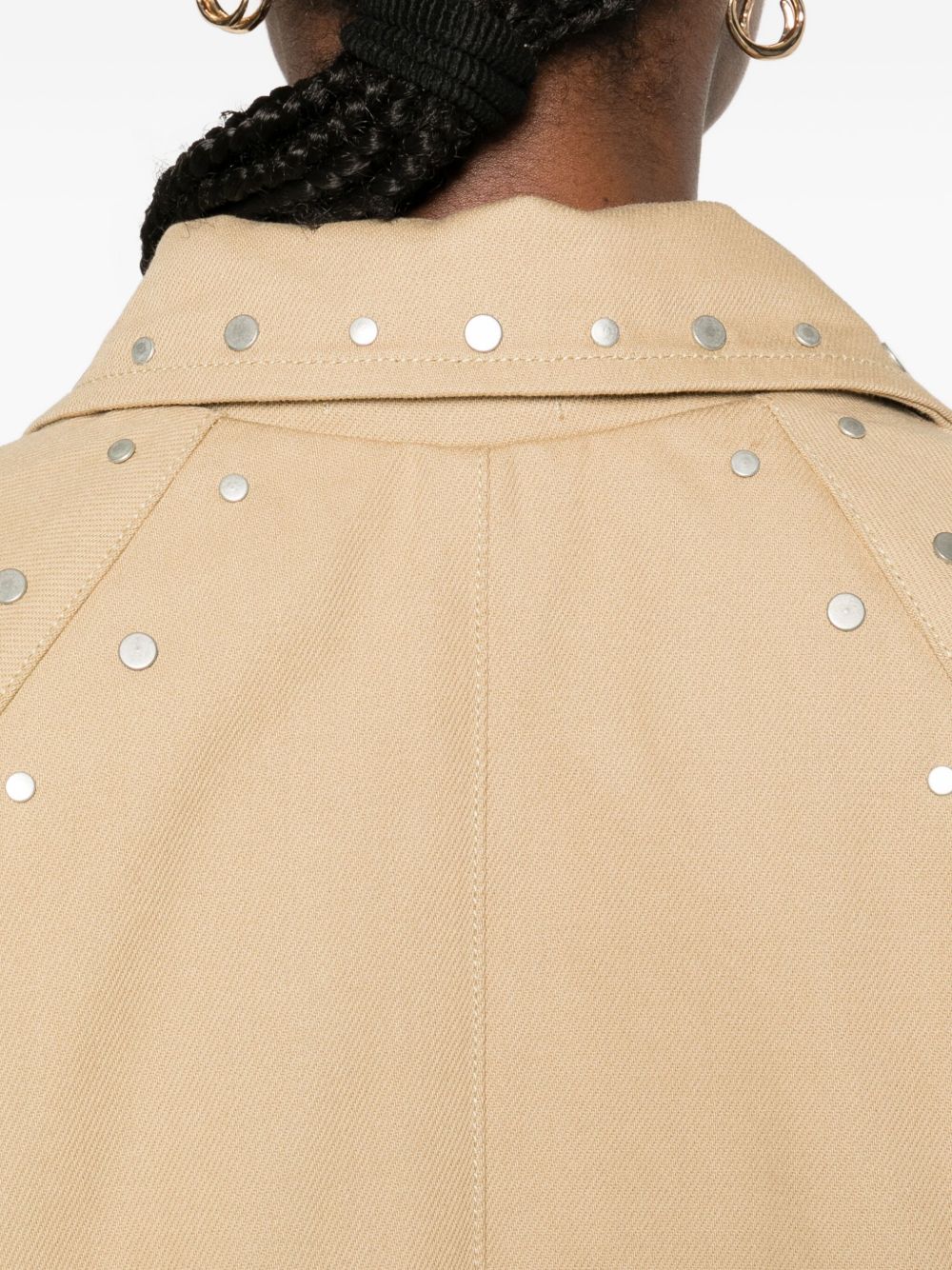 Cappotto beige Tina di Gimaguas in cotone con colletto classico chiusura frontale con bottoni, dettaglio borchie e orlo dritto.