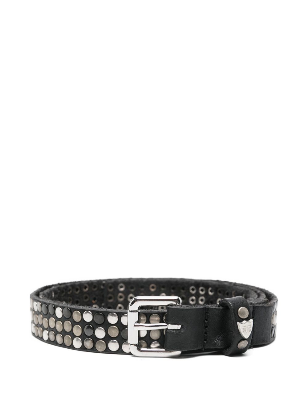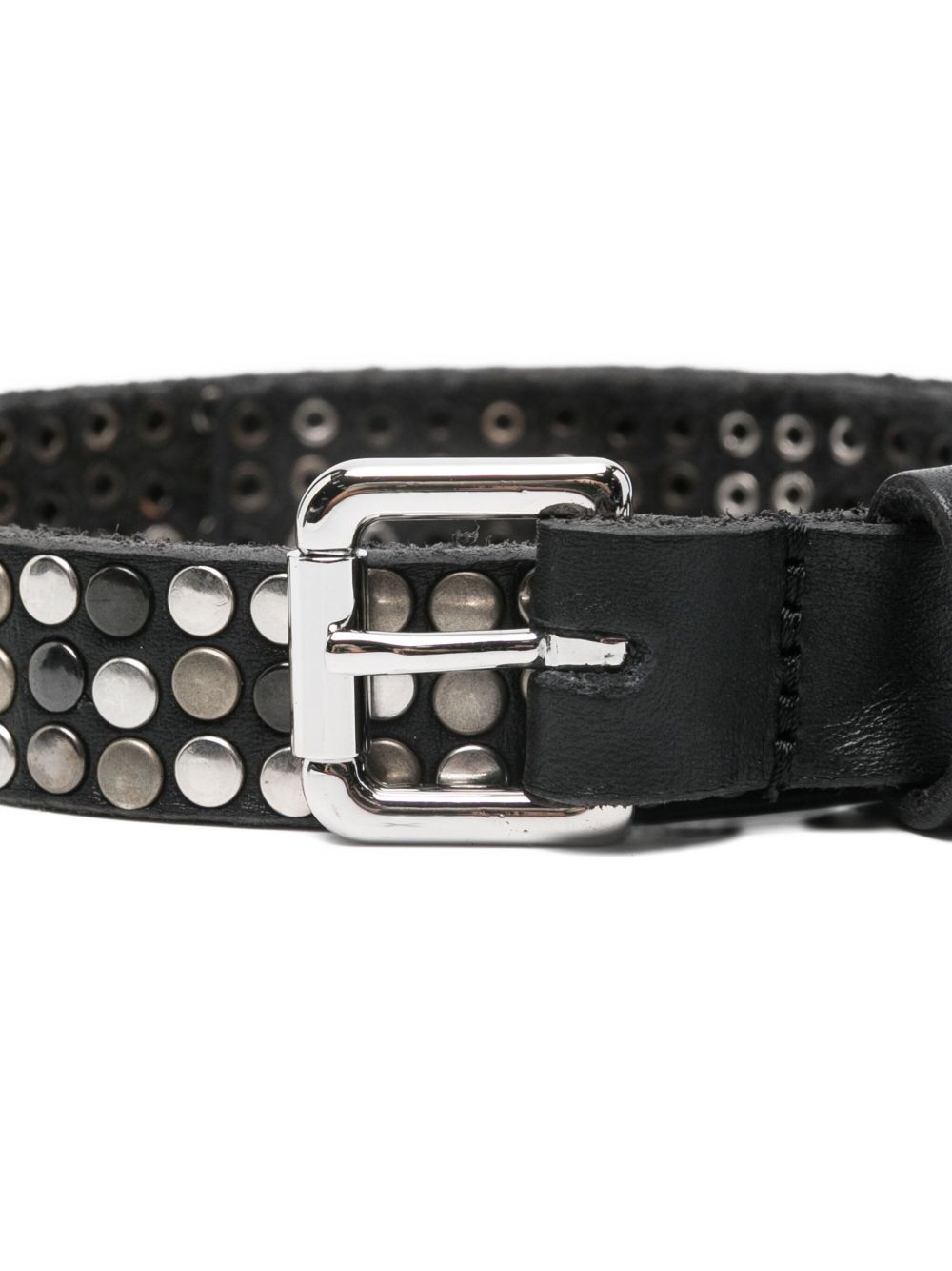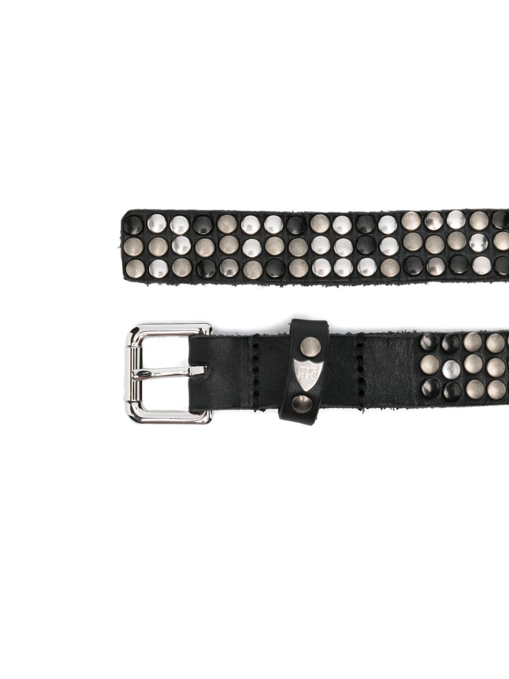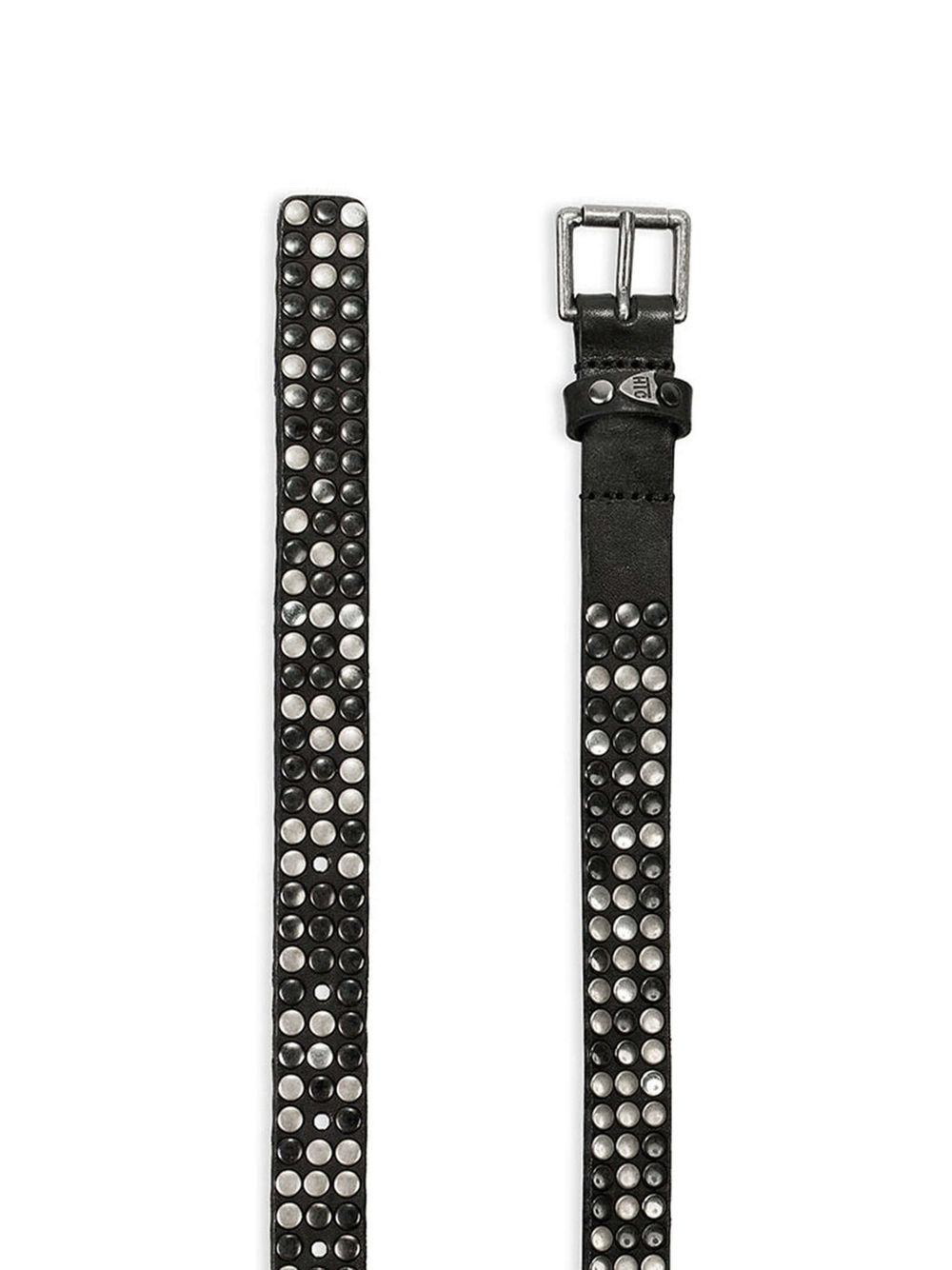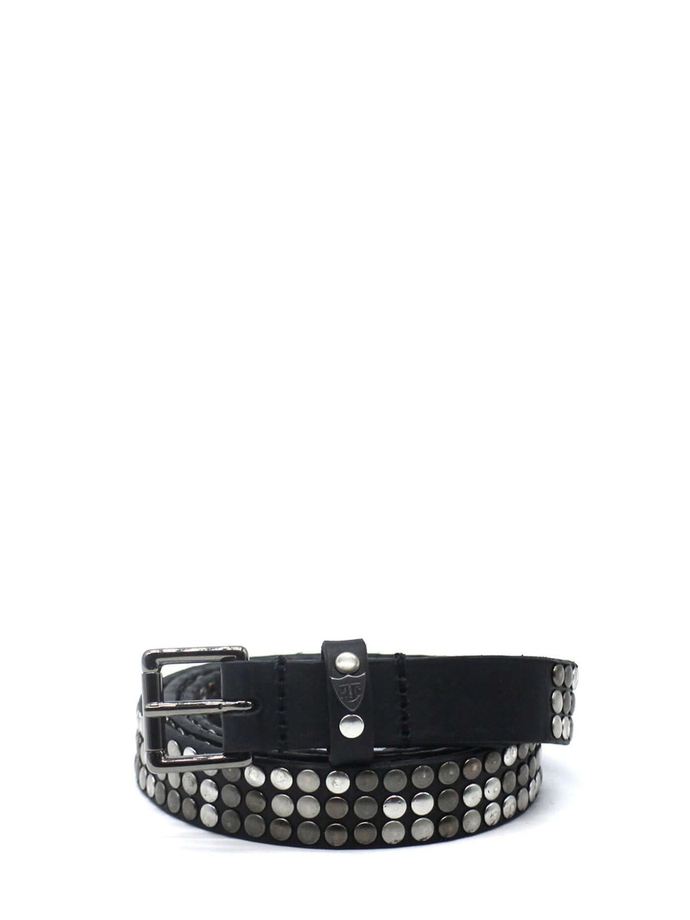 Cintura in pelle con borchie dalla polifinitura, fibbia in ottone, passante con borchie e rivetto in zama con logo inciso, altezza 2 cm.