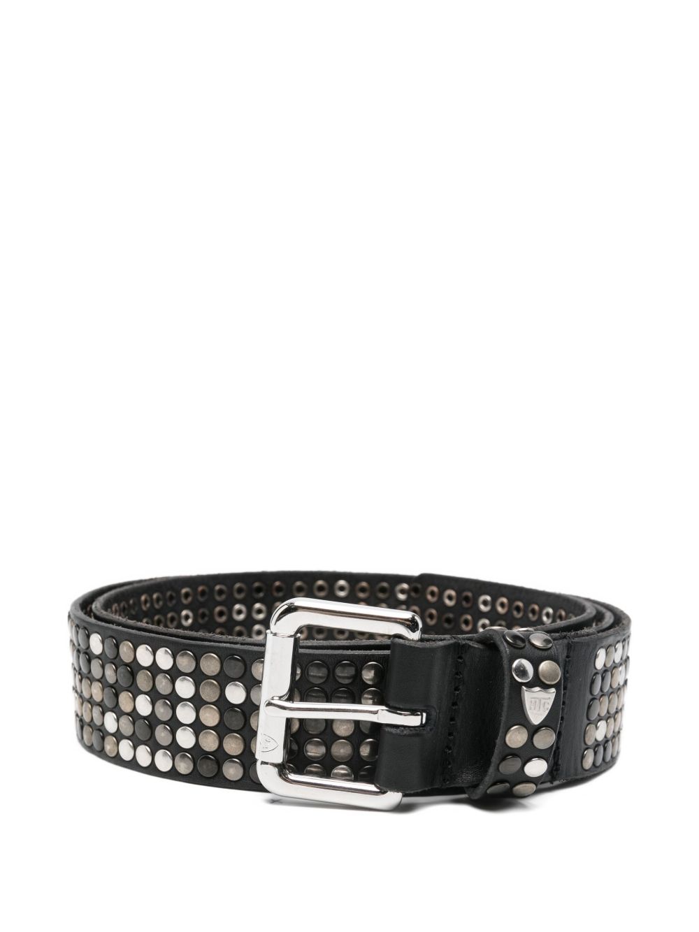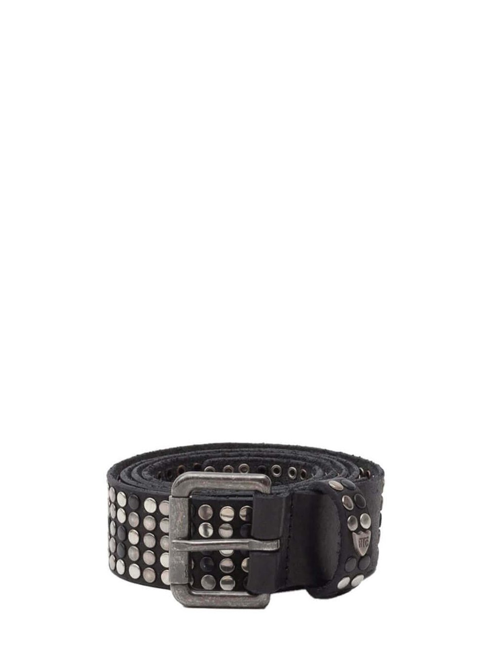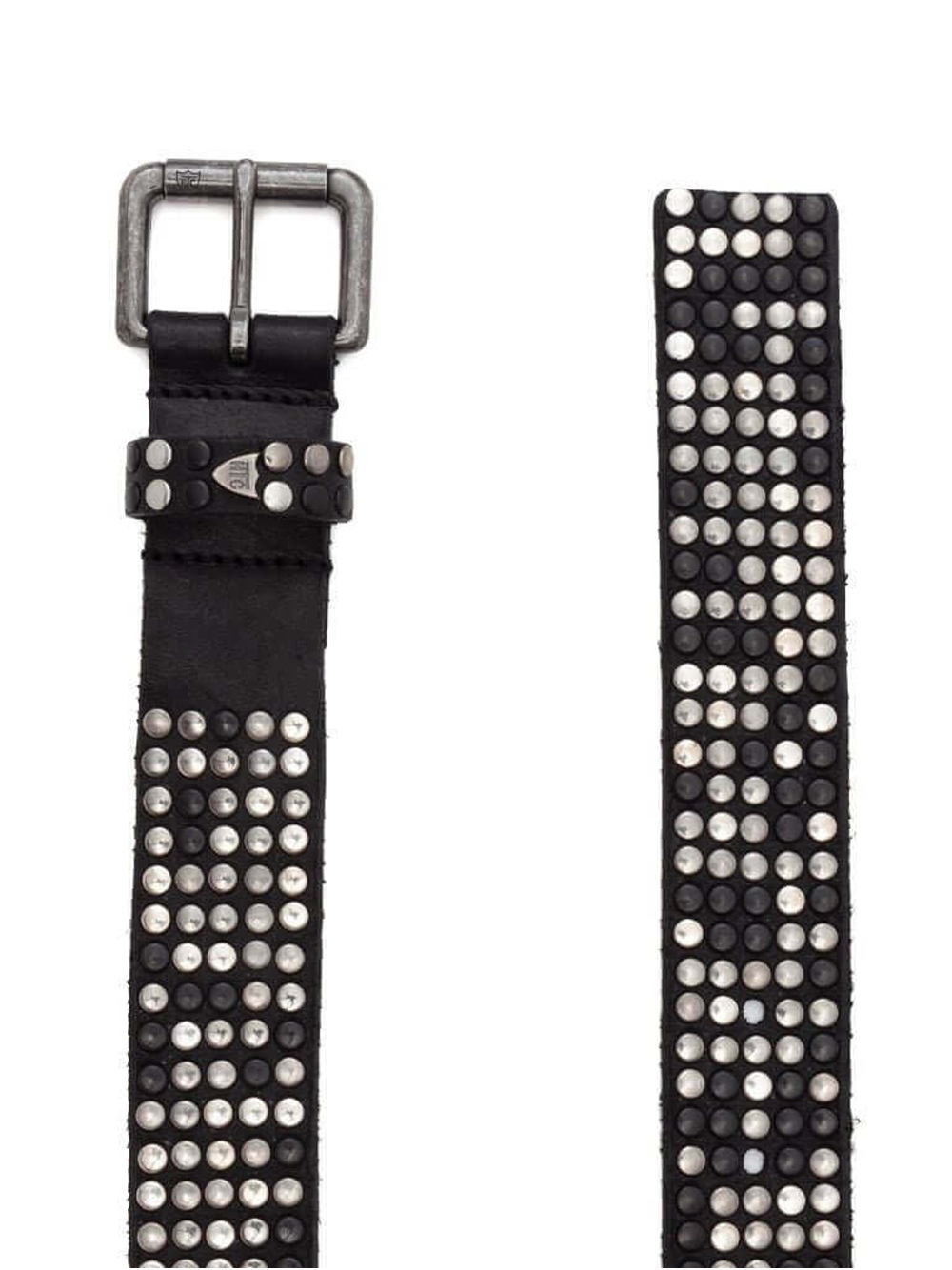 Cintura in pelle con borchie dalla polifinitura, fibbia in ottone, passante con borchie e rivetto in zama con logo inciso, altezza 3,5 cm.