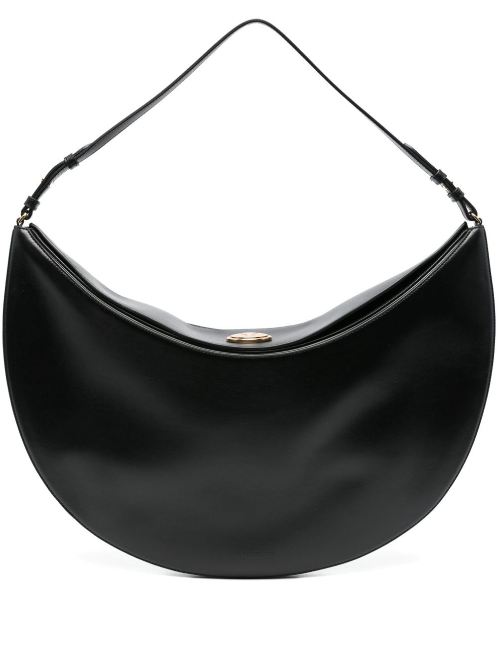 Borsa nera Le Sac Ovalo di Jacquemus in pelle con chiusura magnetica con patta, logo goffrato, tracolla regolabile e forma a mezza luna.