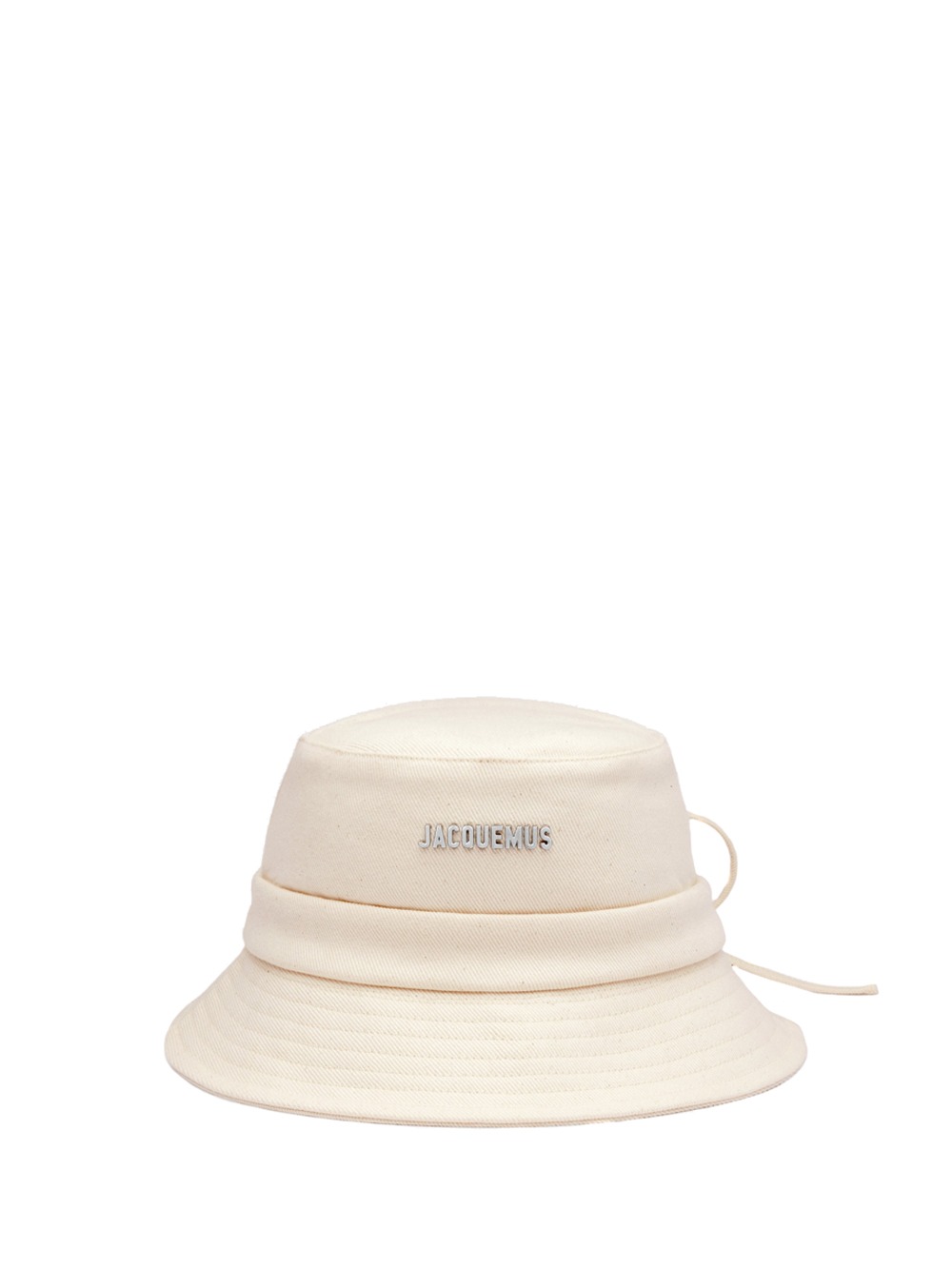 Cappello off white Le Bob Gadjo di Jacquemus in cotone con logo in lettere color argento, laccio posteriore, modello a secchiello con visiera dritta e cuciture tono su tono.