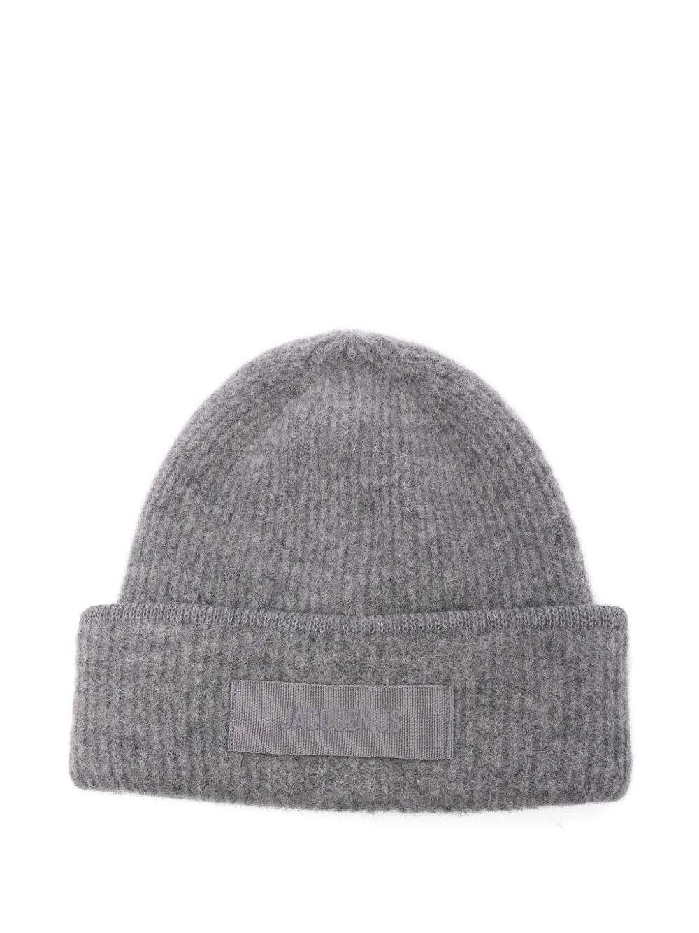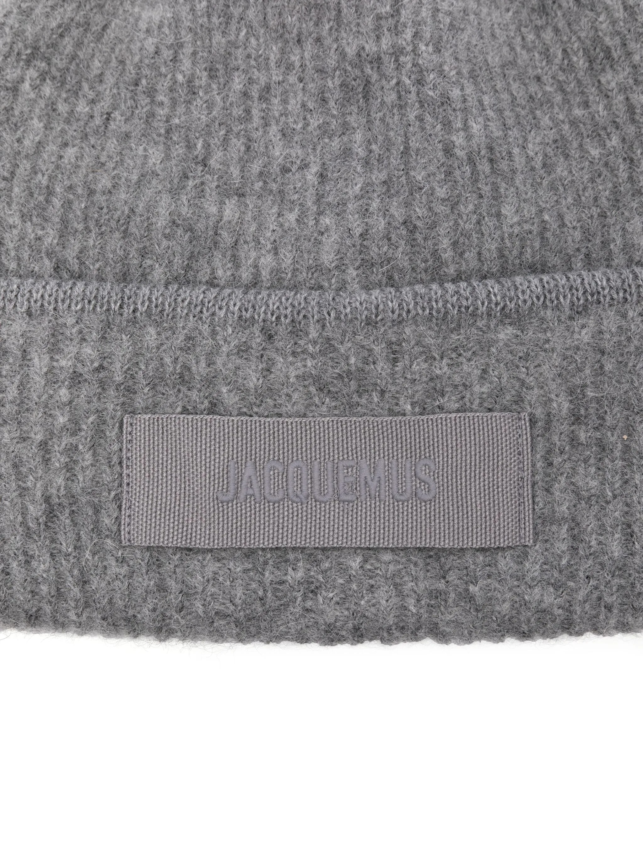 Cappello grigio Le Bonnet Gros Grain di Jacquemus in lana con logo rosso ricamato, orlo con risvolto e lavorazione a costine.