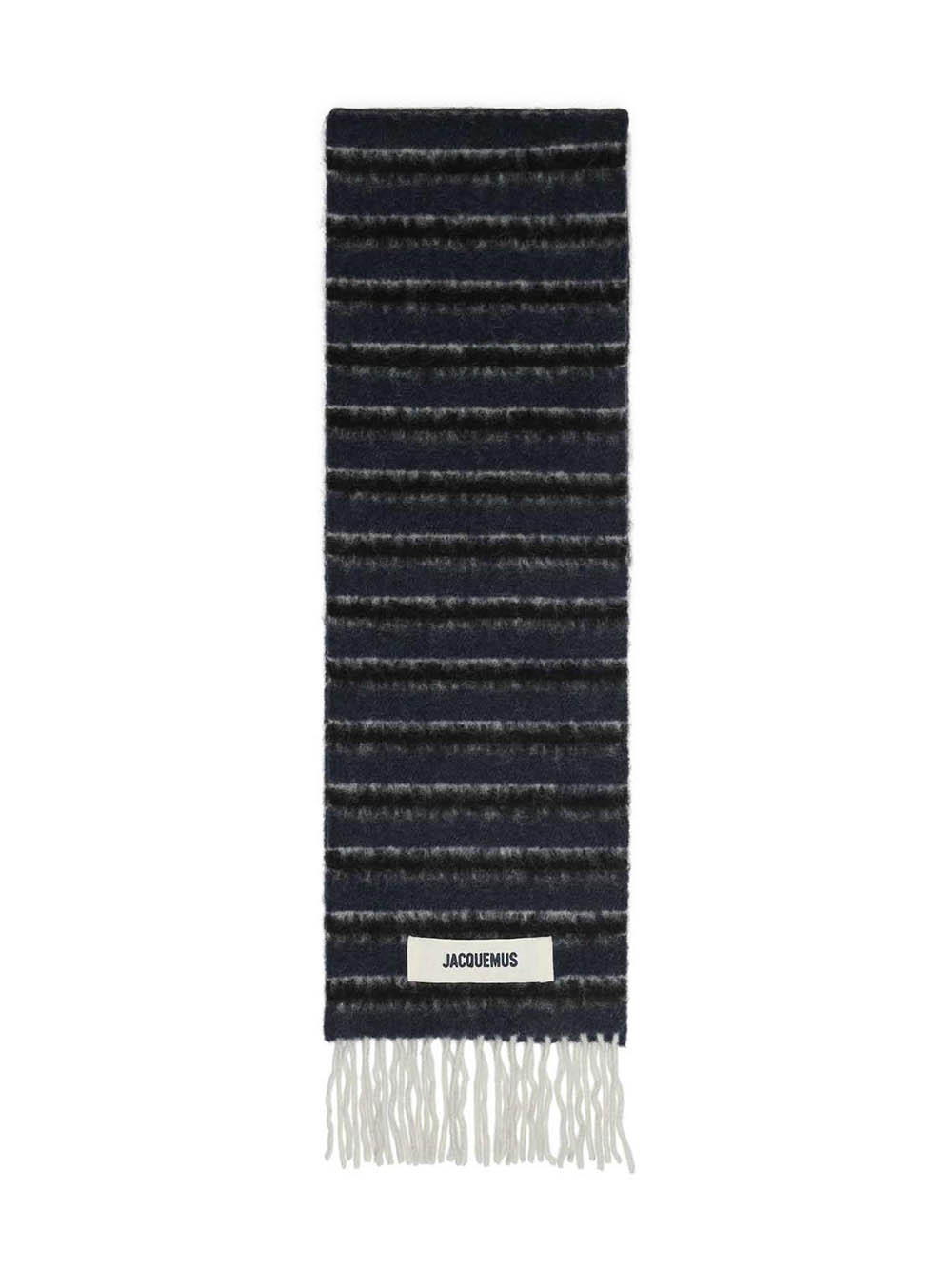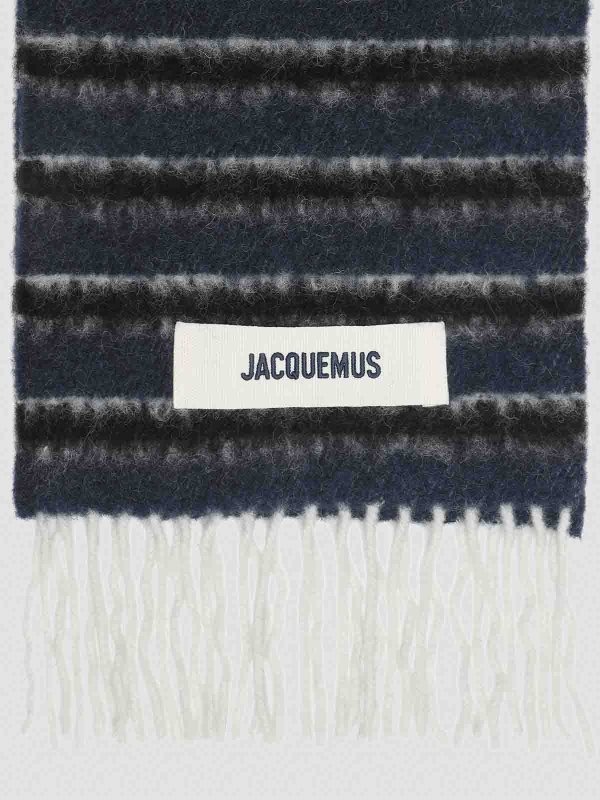 Sciarpa a righe blu e grigia di Jacquemus in lana con etichetta e orlo con frange.