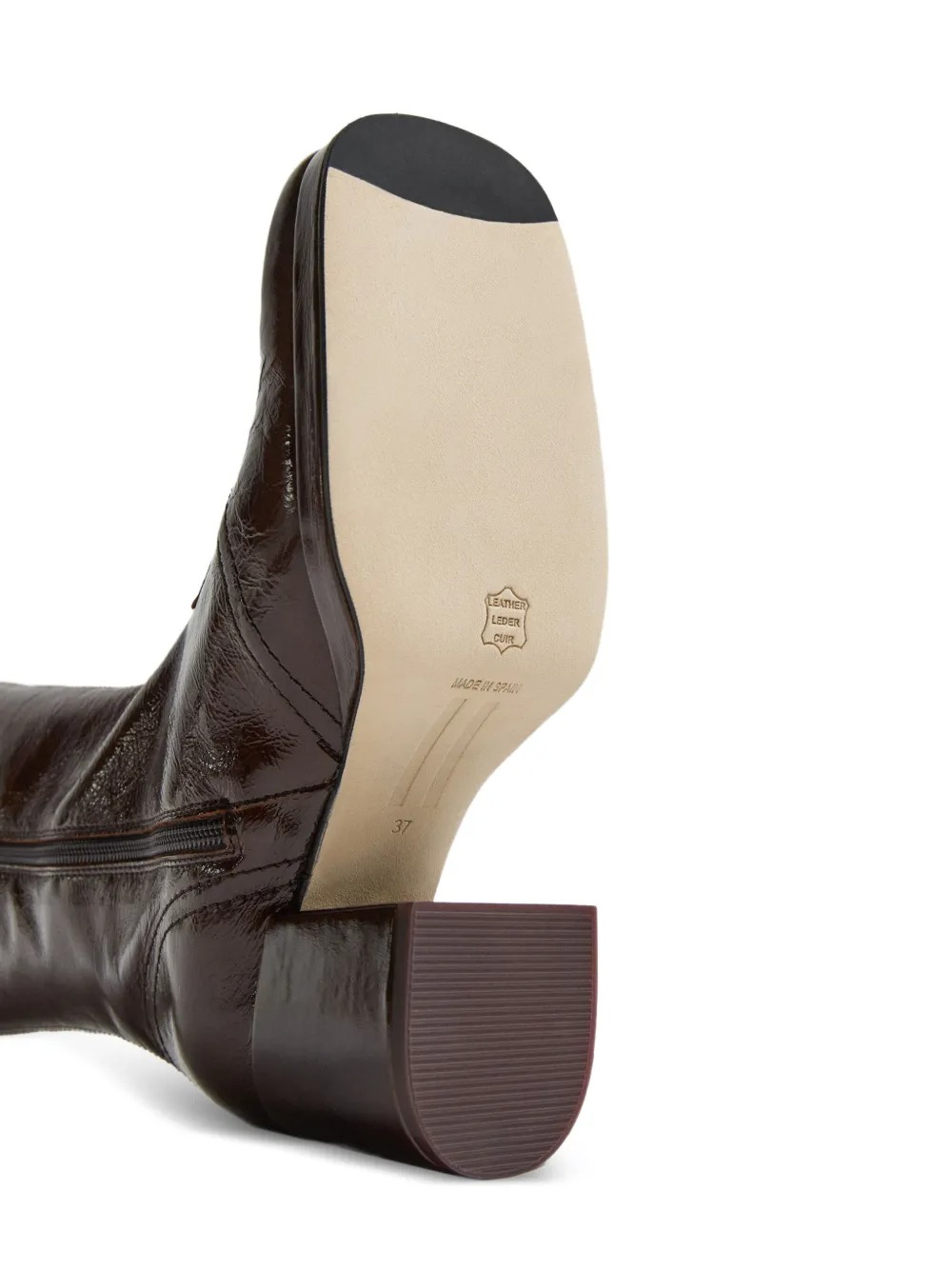 Stivali marroni Cass di Miista in pelle con punta quadrata, tacco largo e chiusura con zip.