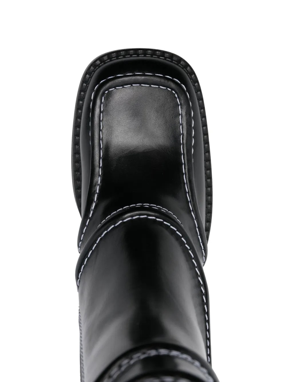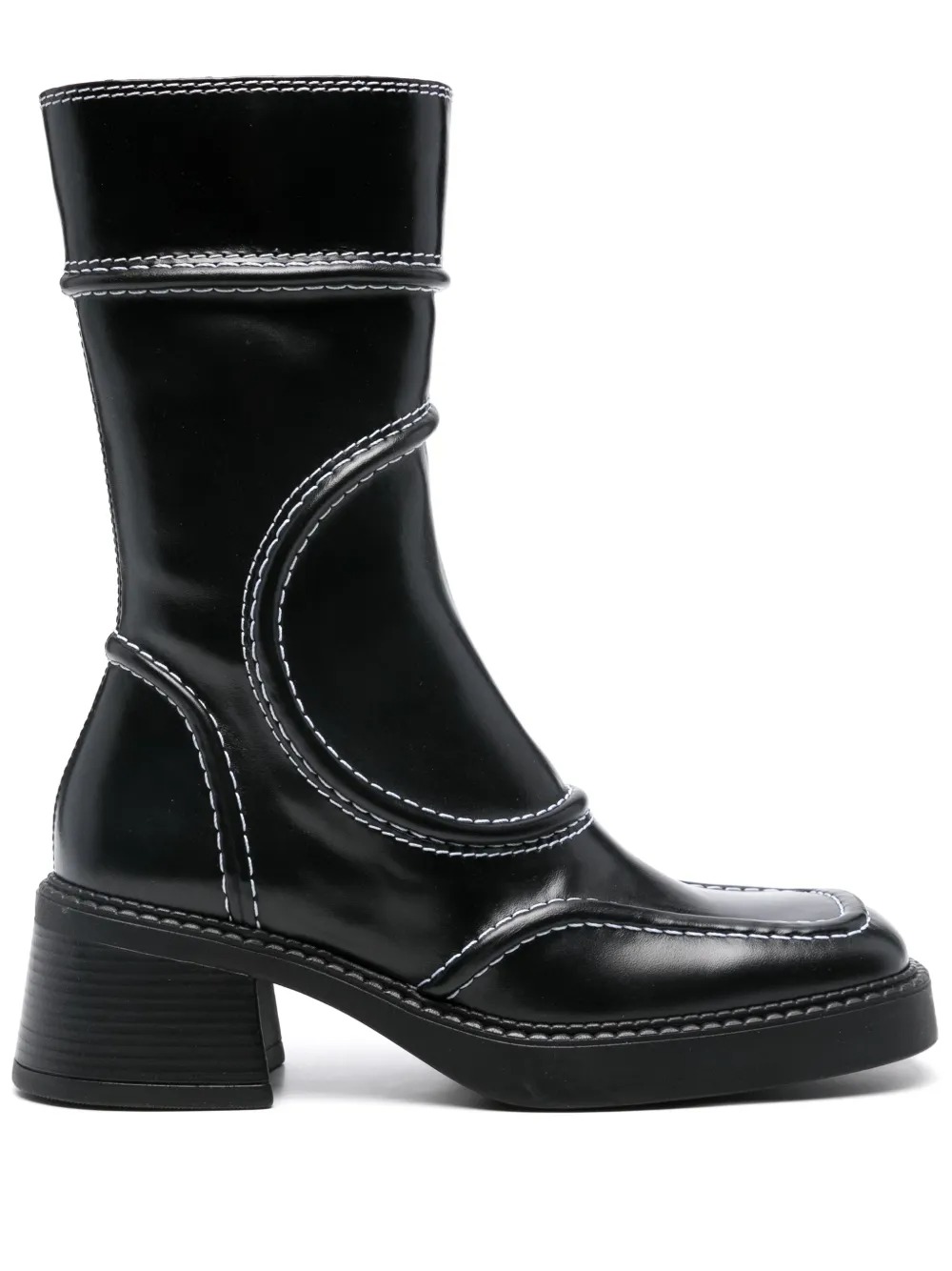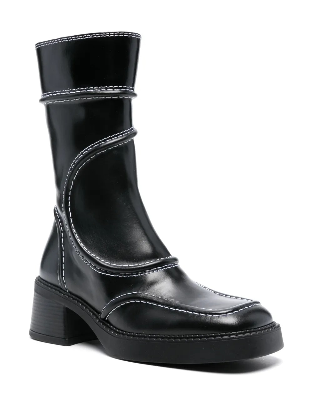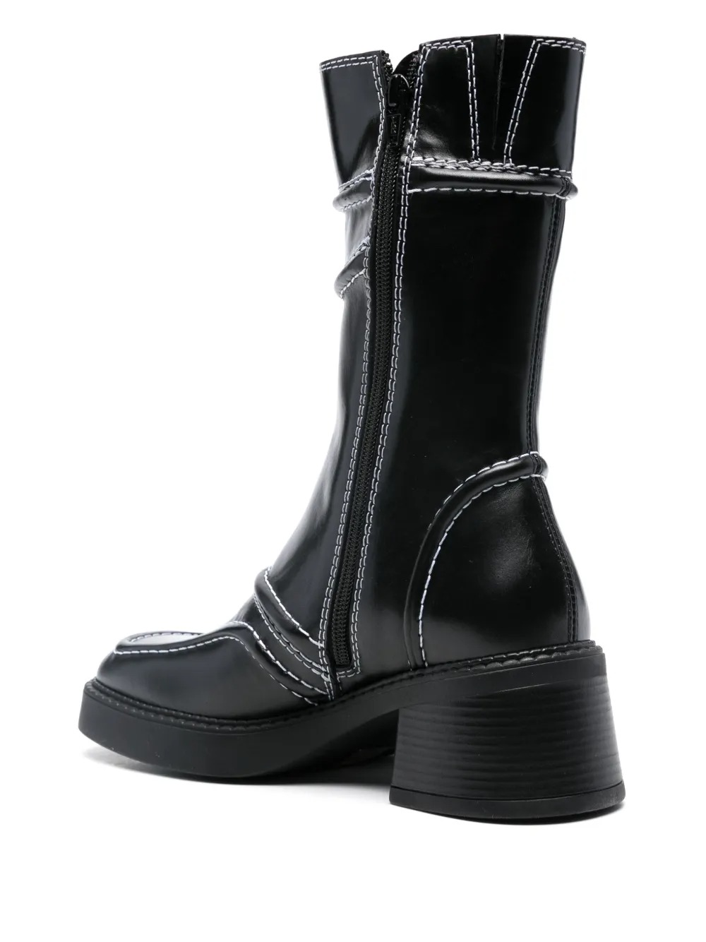 Stivali nere Malene di Miista in pelle con chiusura laterale con zip, cuciture a contrasto, inserto laterale elasticizzato, dettaglio con cuciture, punta quadrata, tacco largo medio 60mm e suola esterna in gomma.