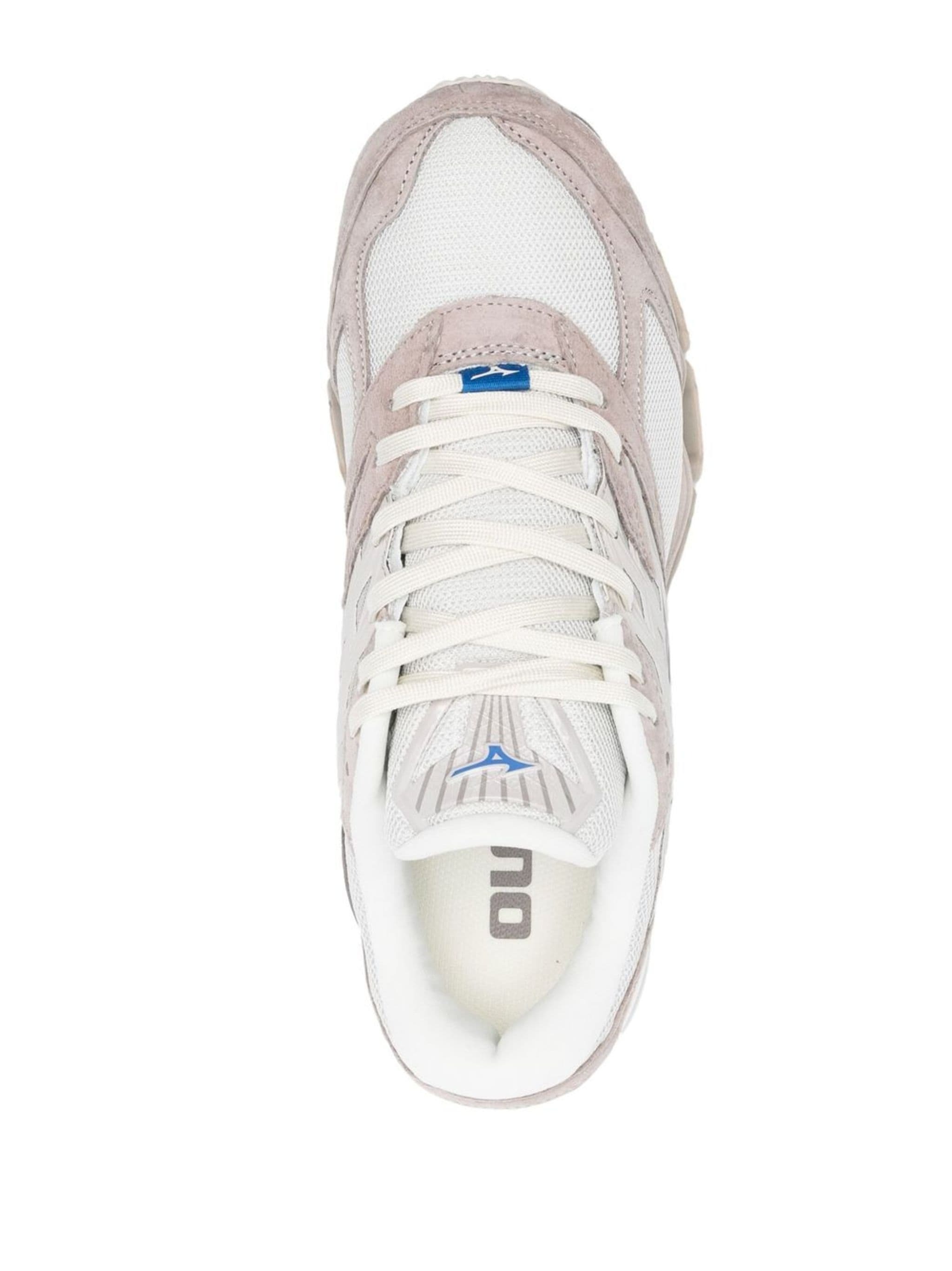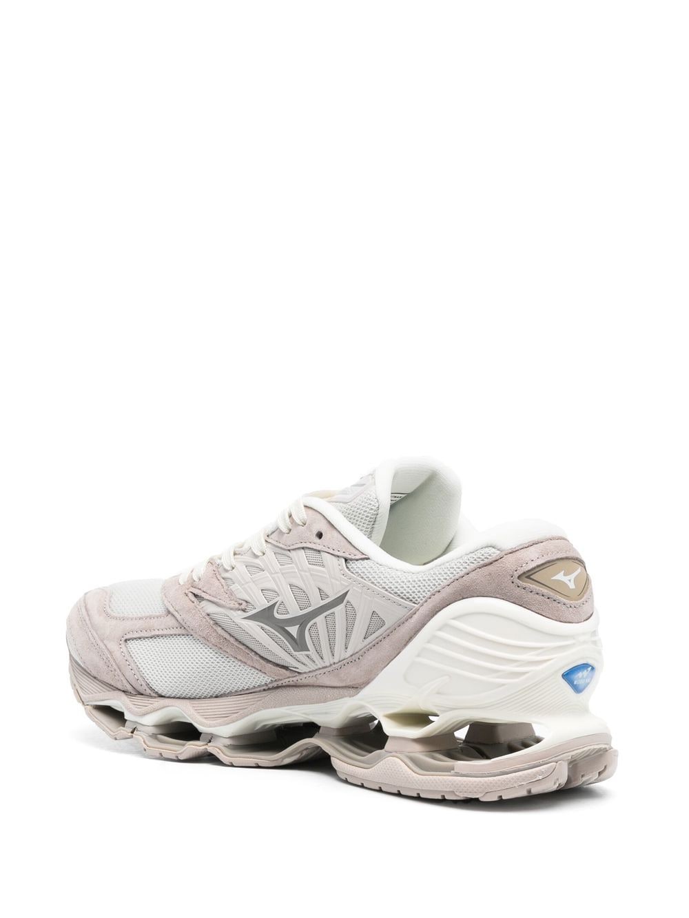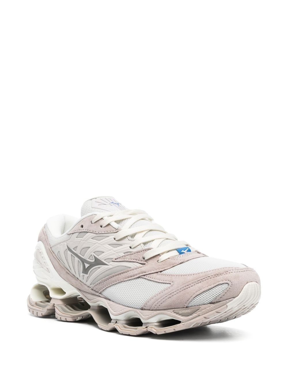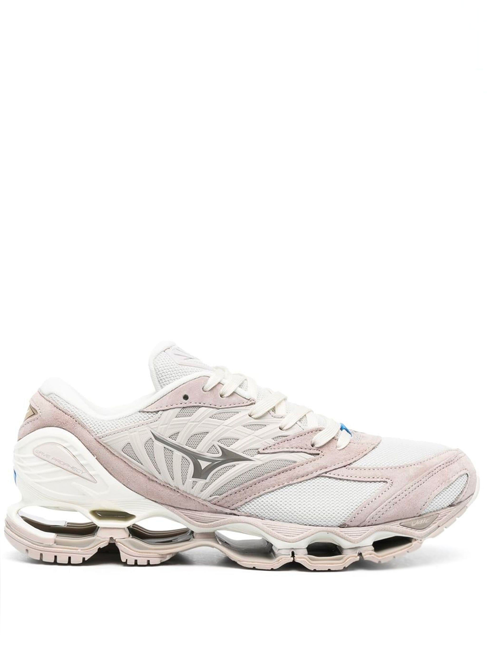 Sneakers bianche Wave Prophecy ls di Mizuno in suede con punta tonda, chiusura frontale con lacci, logo laterale e suola alta 4 cm in gomma.