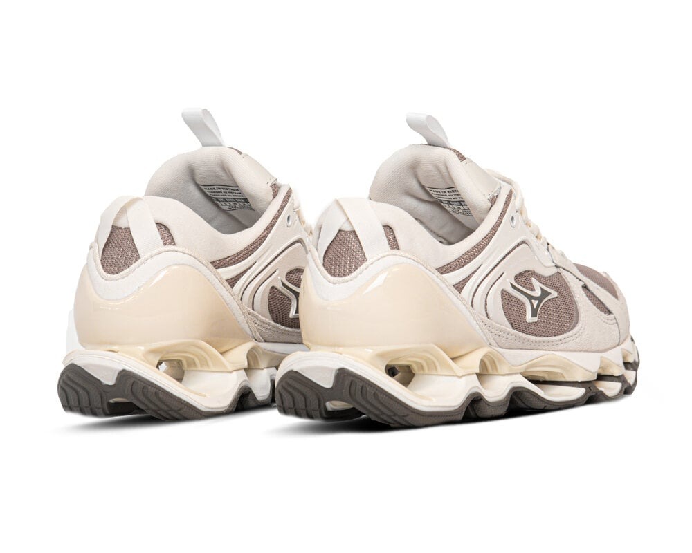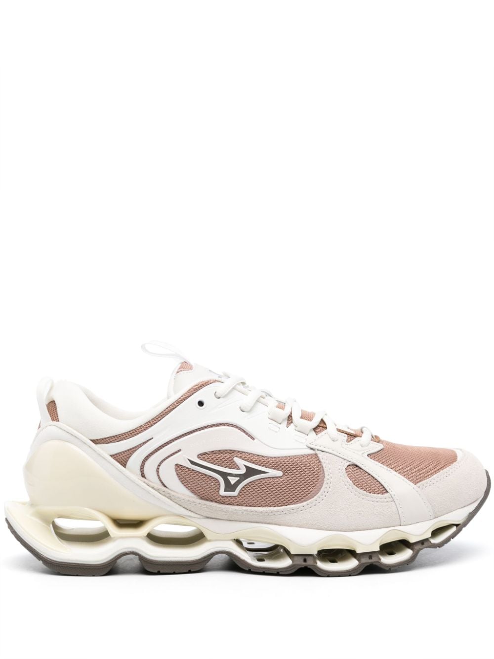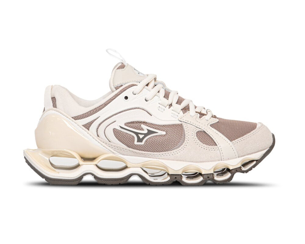 Sneakers beige Wave Prophecy ls di Mizuno in suede con punta tonda, chiusura frontale con lacci, logo laterale e suola alta 4 cm in gomma.