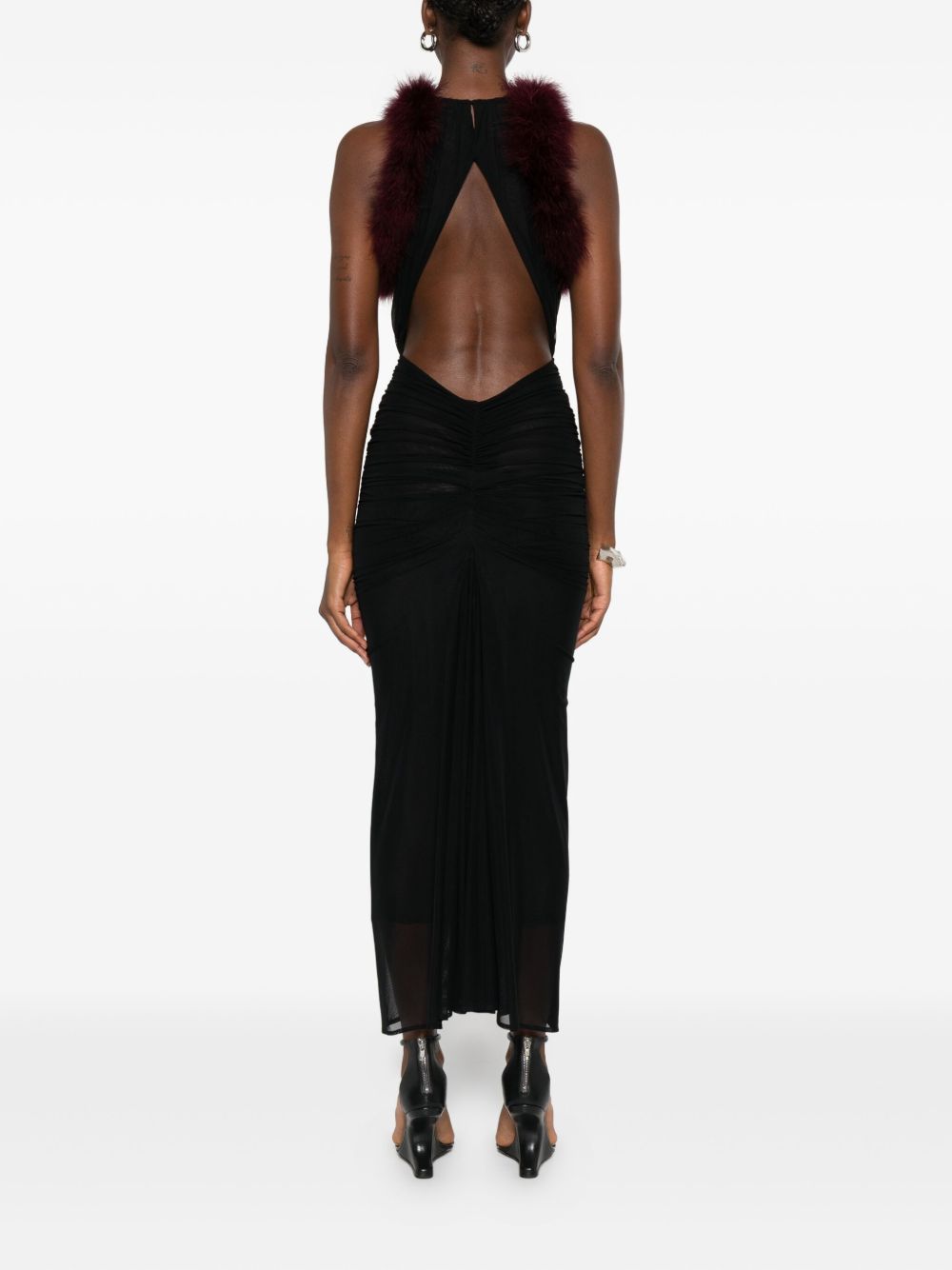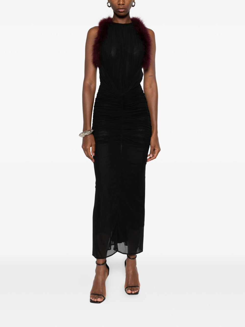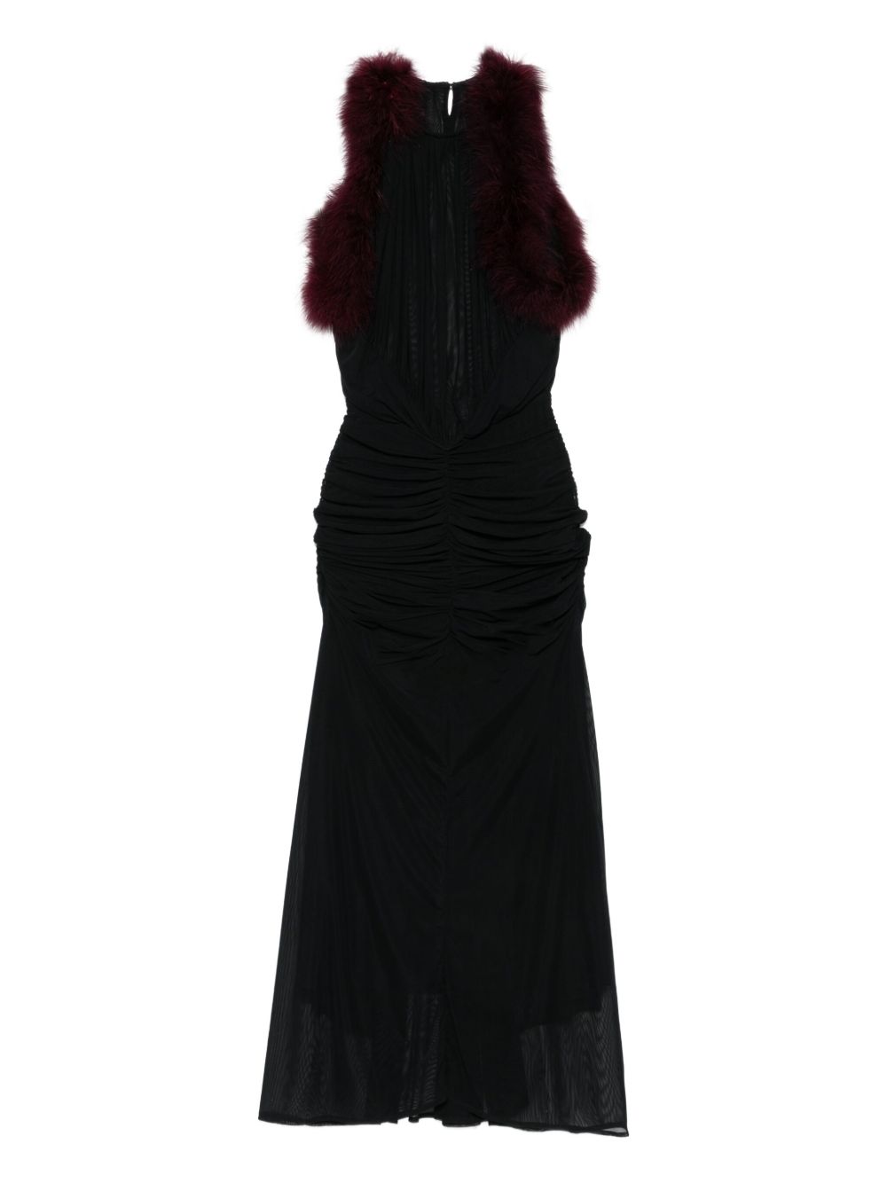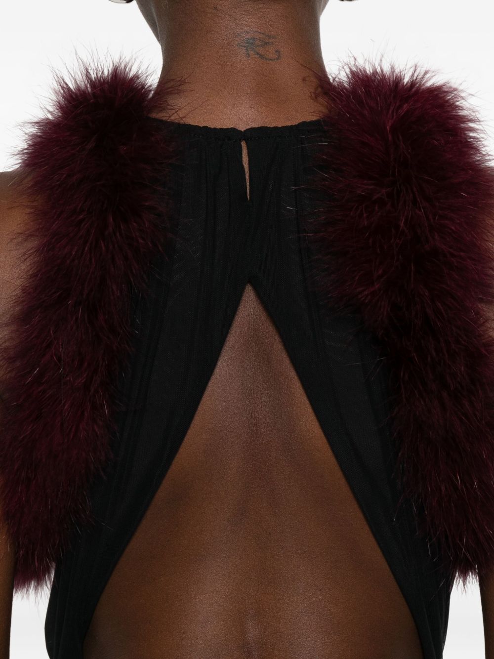 Abito nero e borgogna Marabou Ruched di Mugler in poliammide con corsetto arricciatto, scollo posterio e design senza maniche.