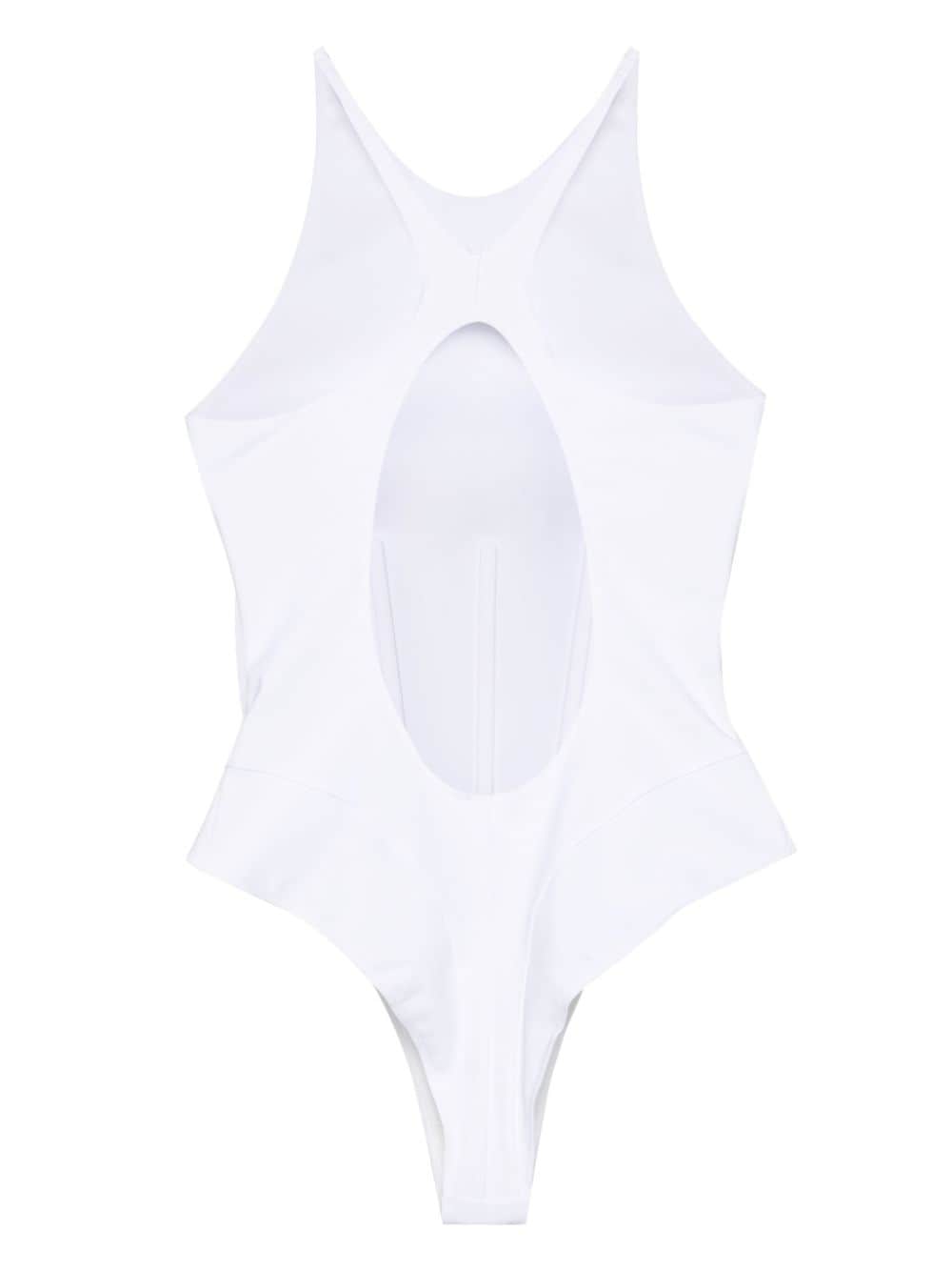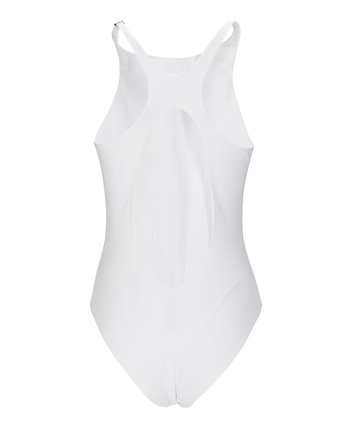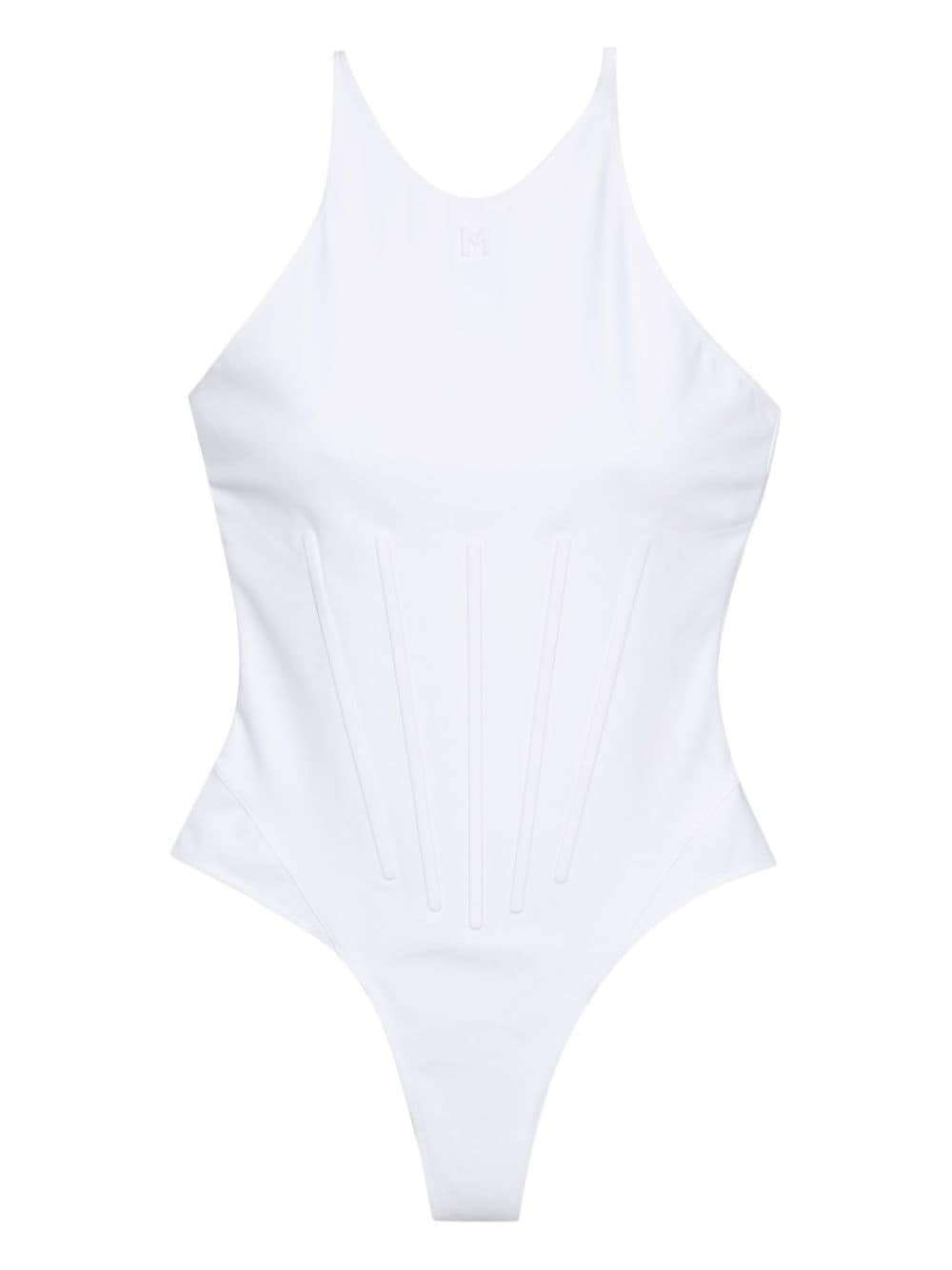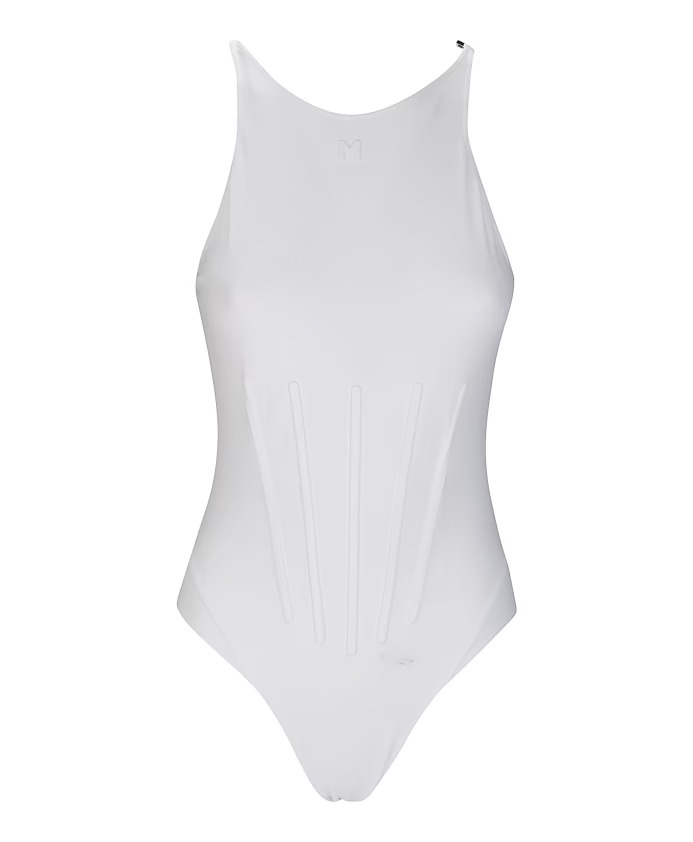 Costume intero bianco di Mugler in poliammide con design elasticizzato, scollo rotondo, goffrato nella parte anteriore, corsetto senza spalline, scollo olimpionico e dettaglio cut-out posteriore.