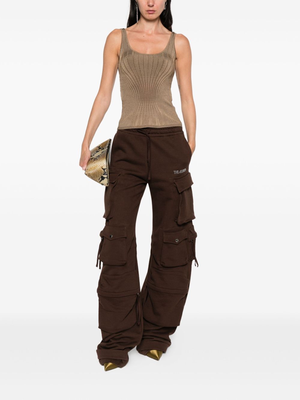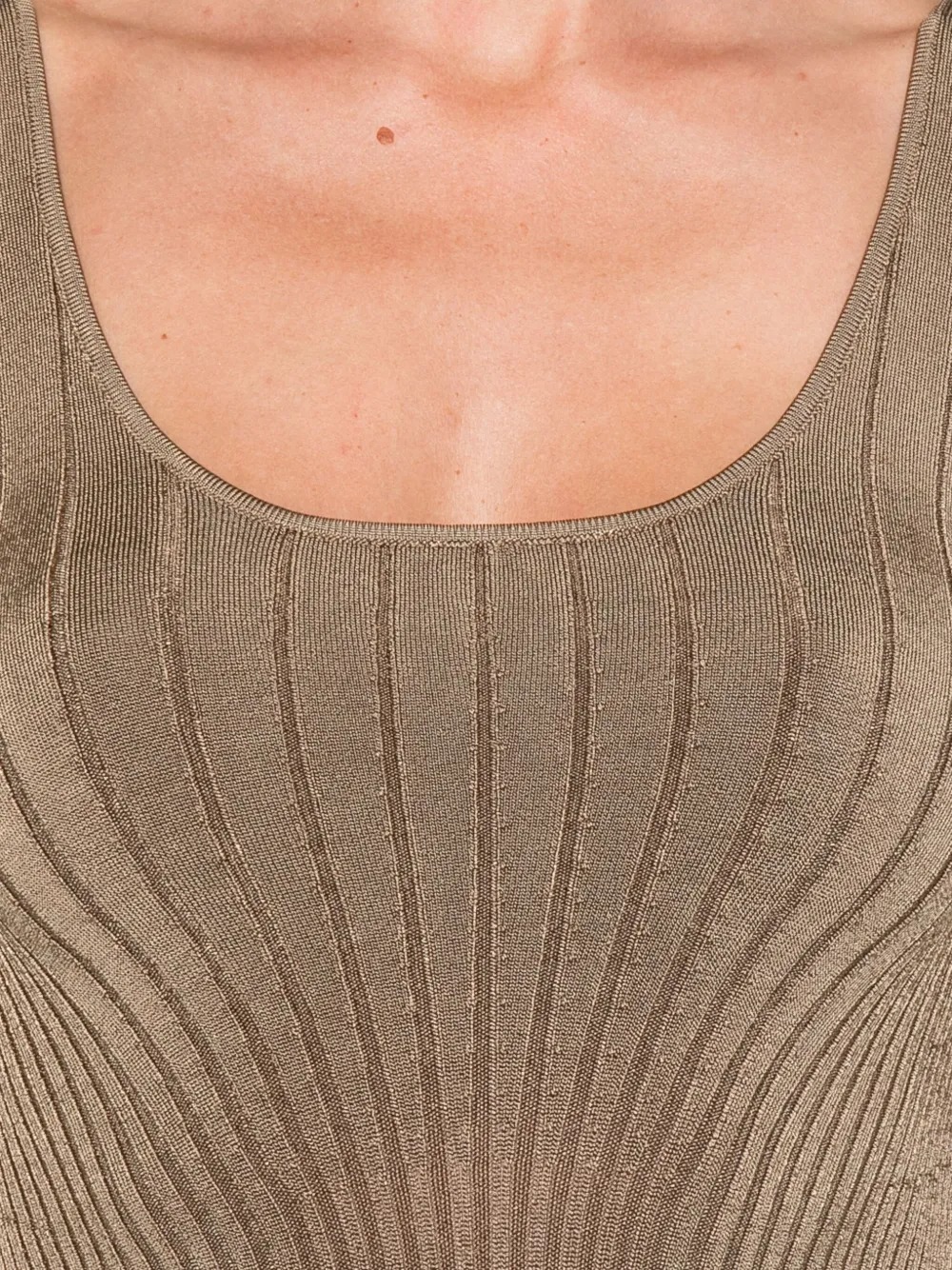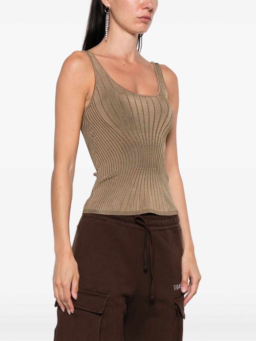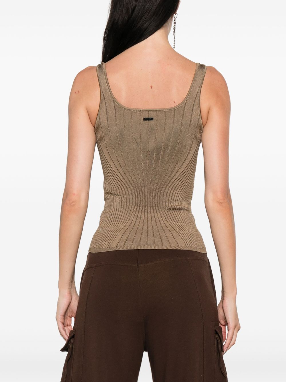 Top beige a costine di Mugler in rylon con scollo squadrato, design senza maniche, placca con logo e orlo dritto.