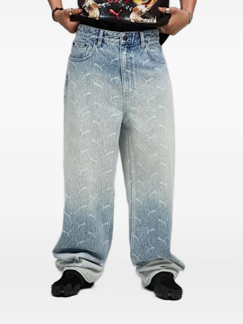 Jeans blu Laser Monogram Denim di Puma x A$ap Rock in cotone con stampa laser all-over, vita con passanti, chiusura frontale con pottone, design 5 tasche e orlo dritto.