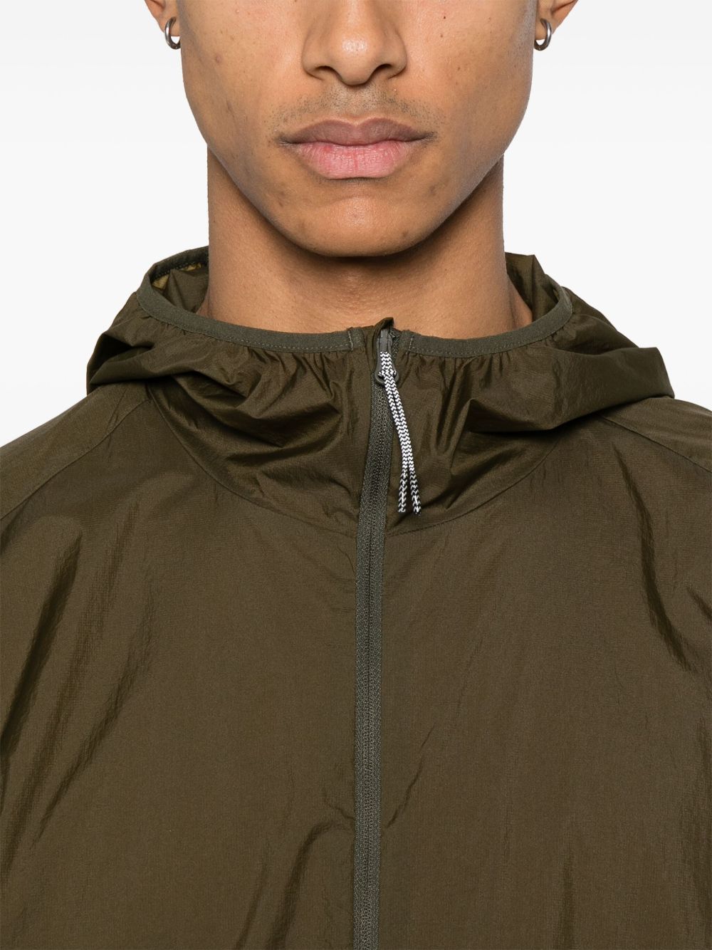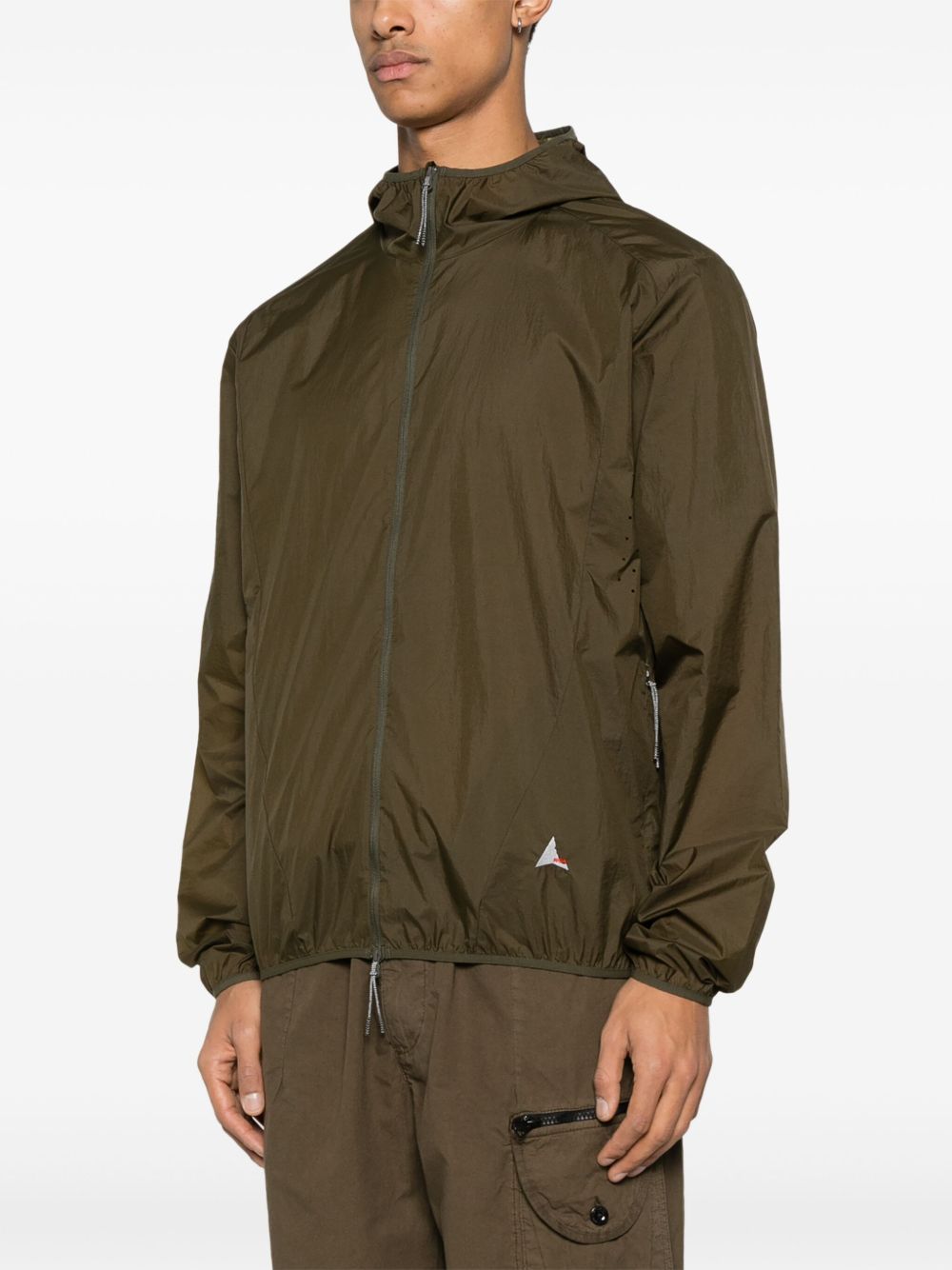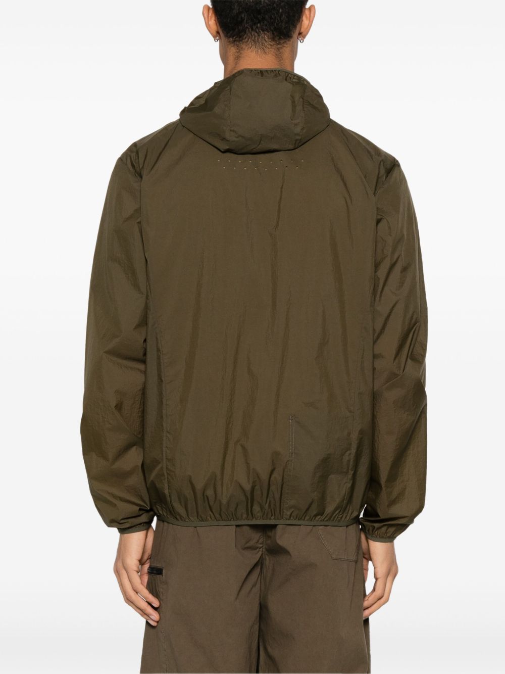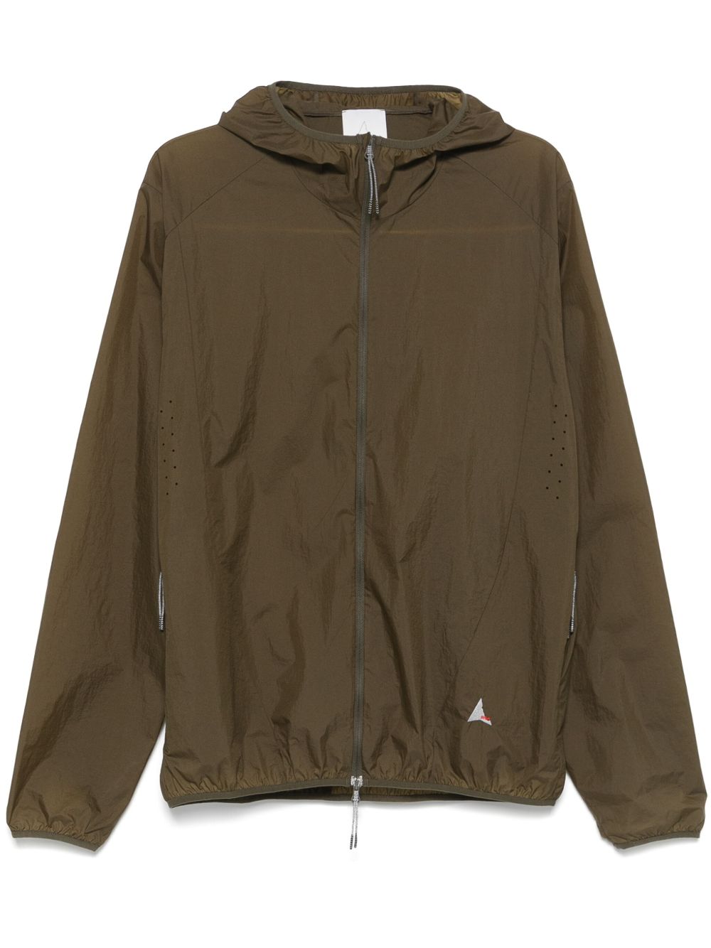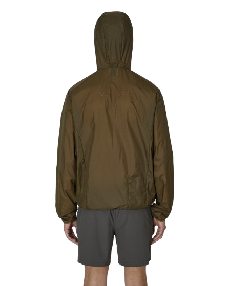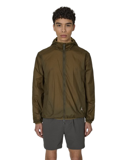 Giacca verde oliva Packable Wind di Roa con chiusura frontale con zip a doppio cursore, cappuccio, orli elasticizzati e due tasche laterali con zip.