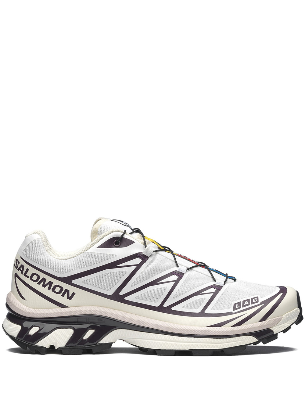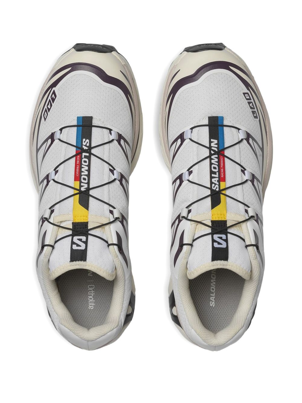 Sneaker bianca XT-6 di Salomon in tessuto con dettagli termosaldati, chiusura con coulisse, punta tonda, fodere in tessuto e suola texturizzata in gomma. Completano il design l'etichetta logo applicata sullla linguetta e il logo stampato lateralmente.