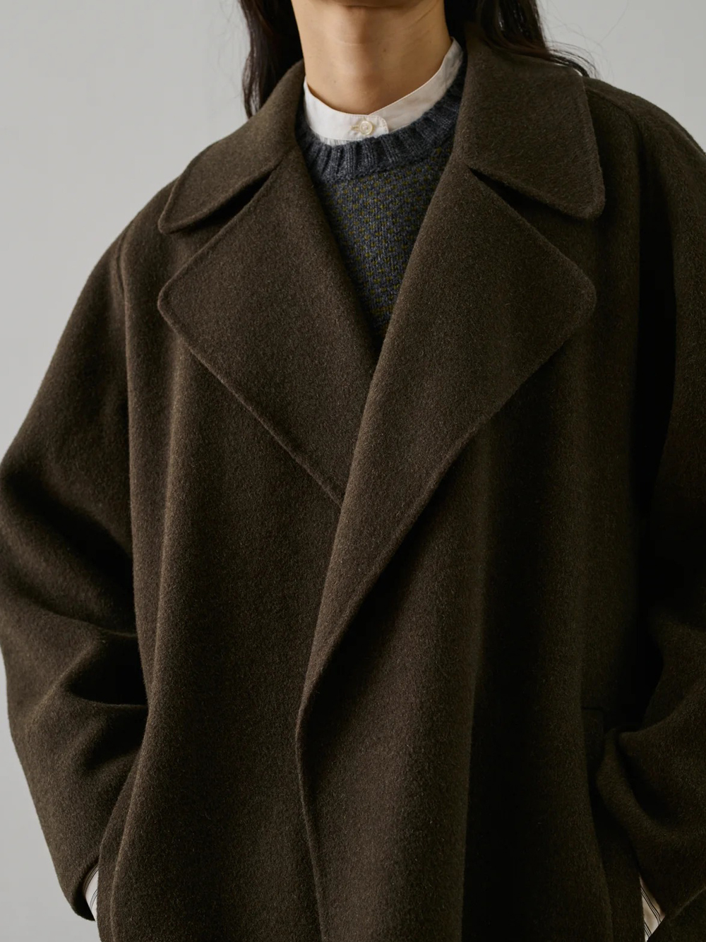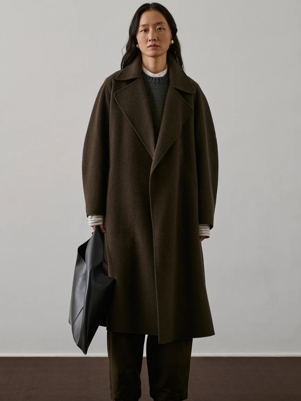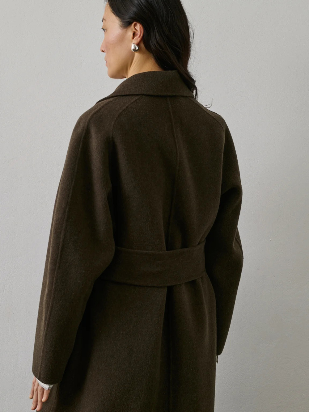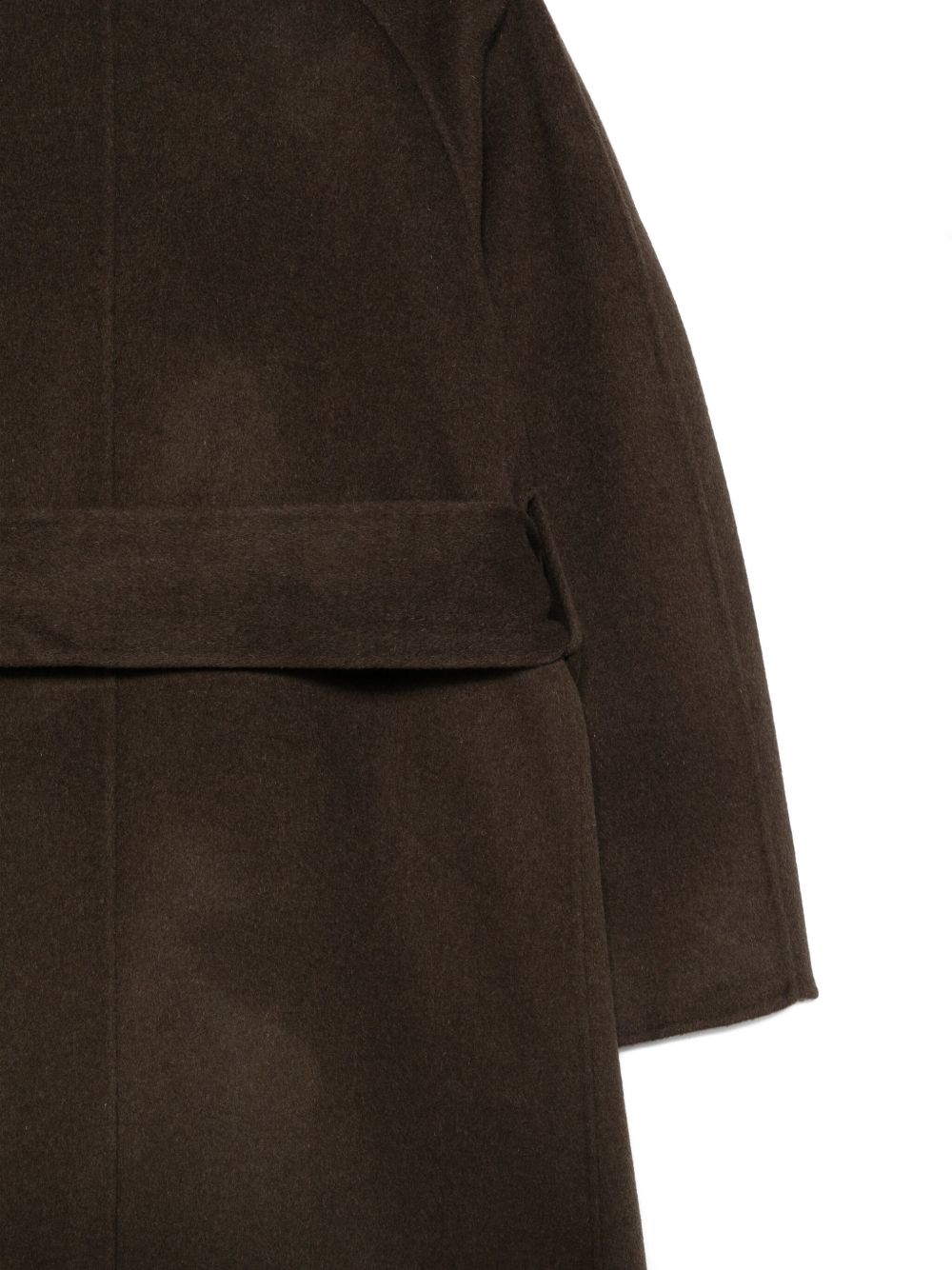 Cappotto marrone khaki Harvard di Soeur in lana con colletto ambio, cintura removibile, tasche laterali e orlo dritto.