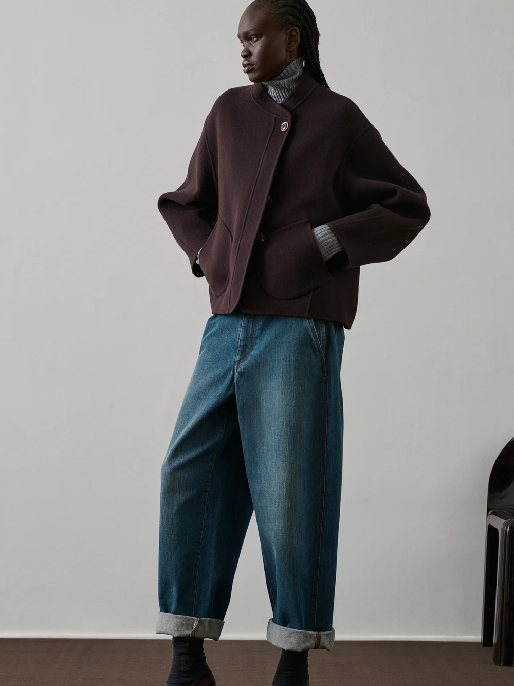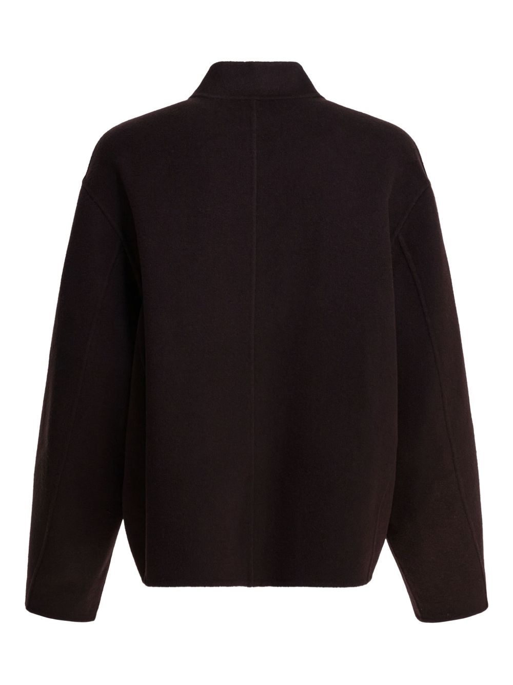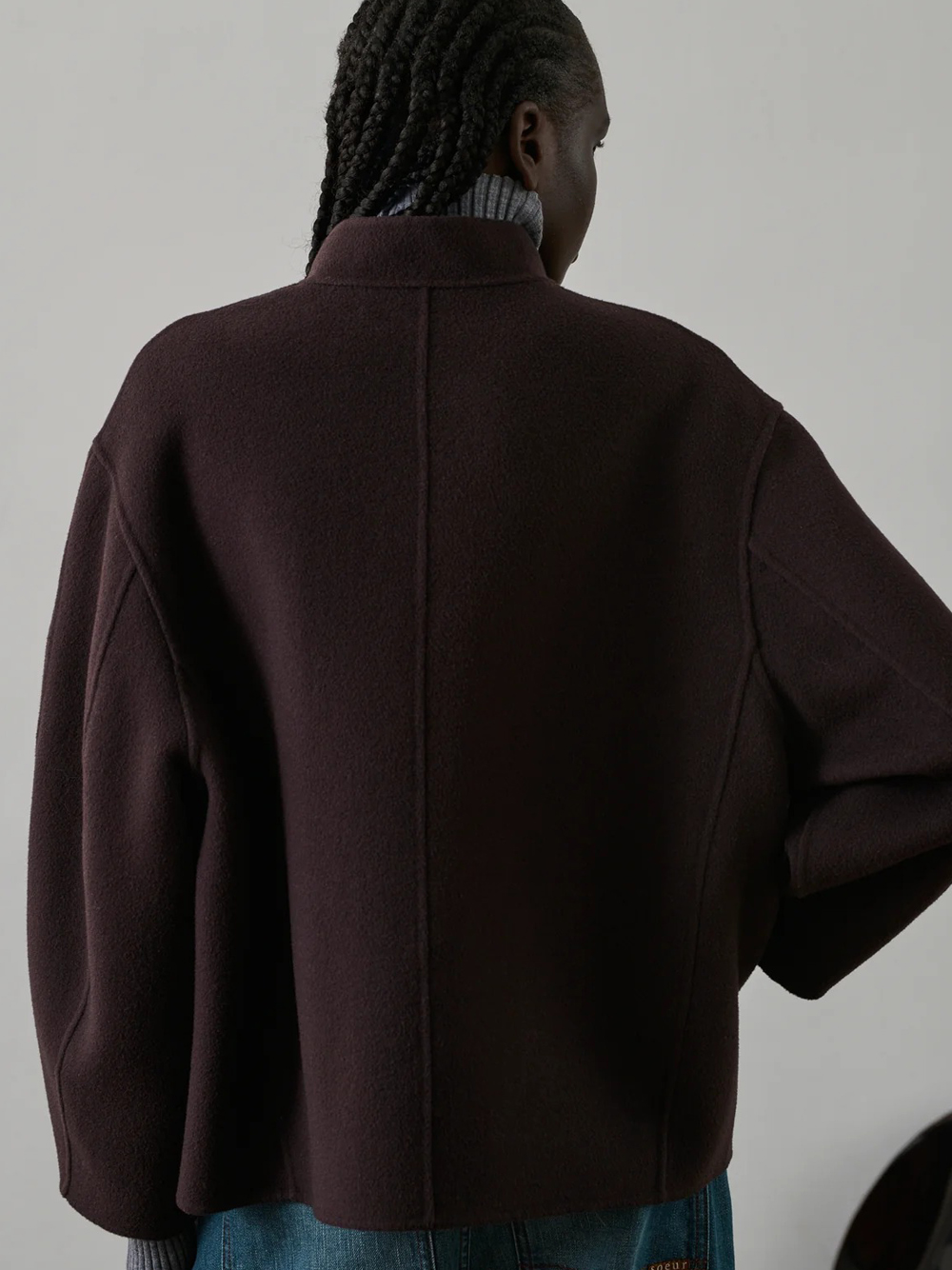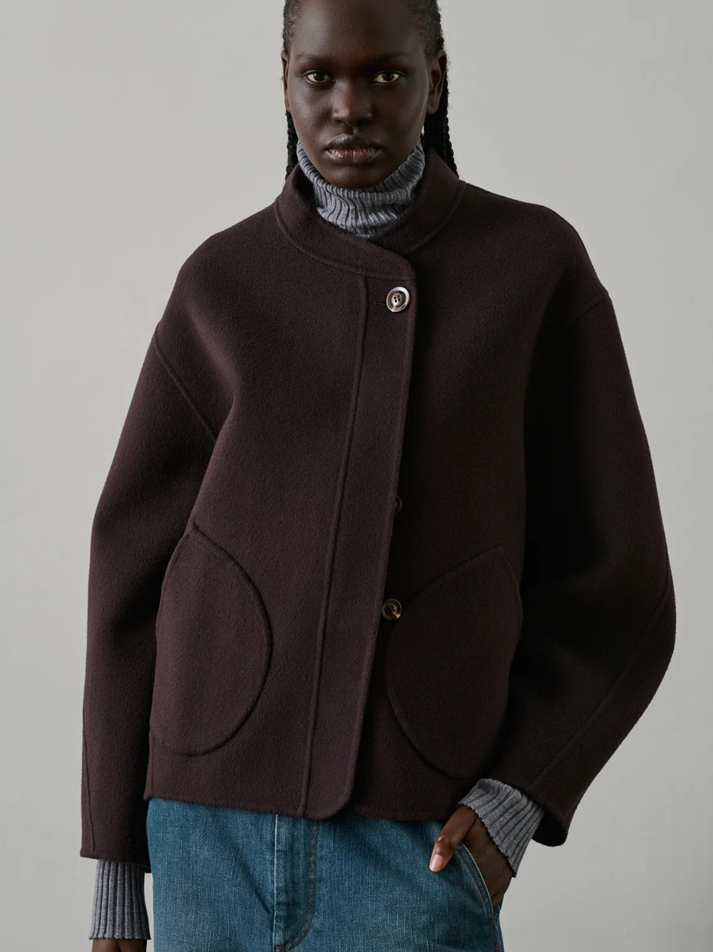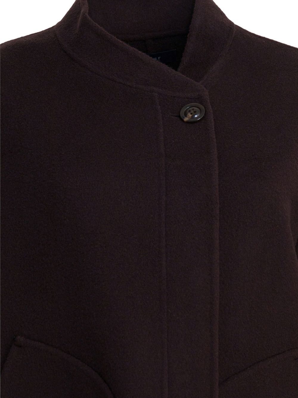 Cappotto melanzana Windsor di Soeur in lana con design senza collo, chiusura con un bottone a vista, tasche tonde e orlo dritto.
