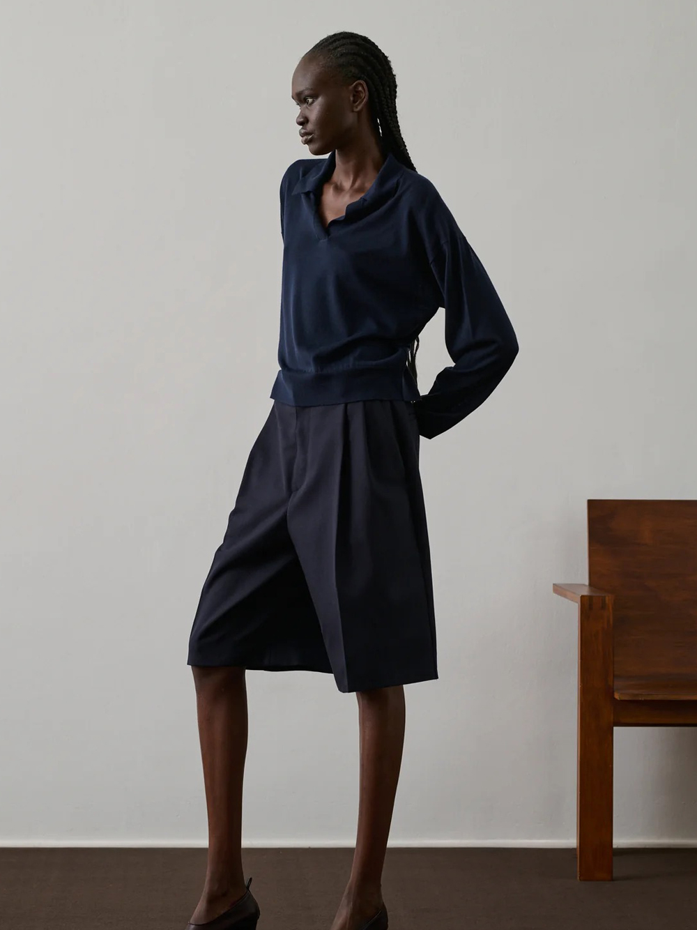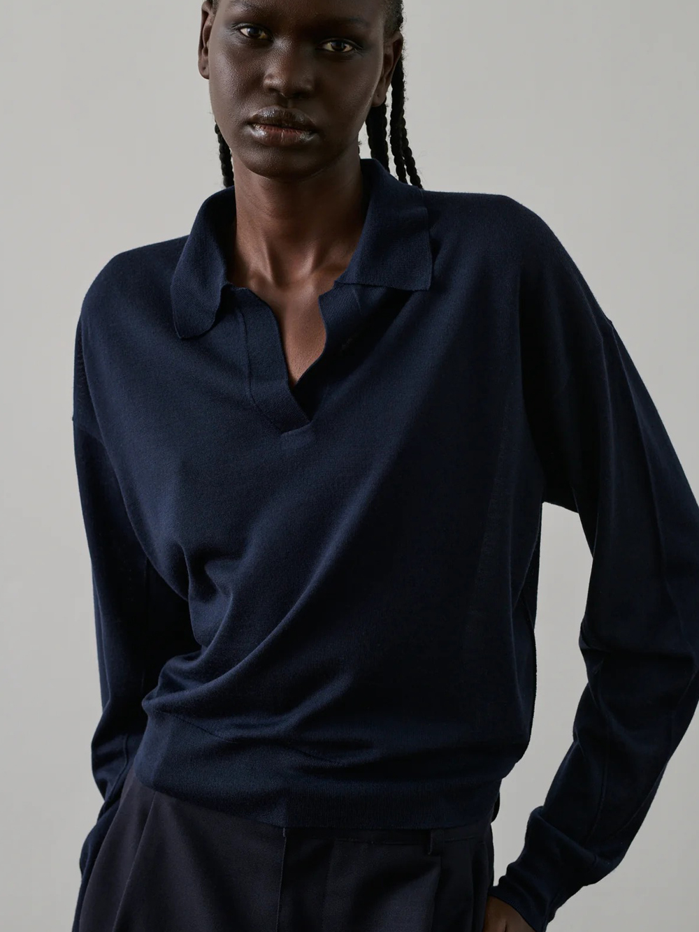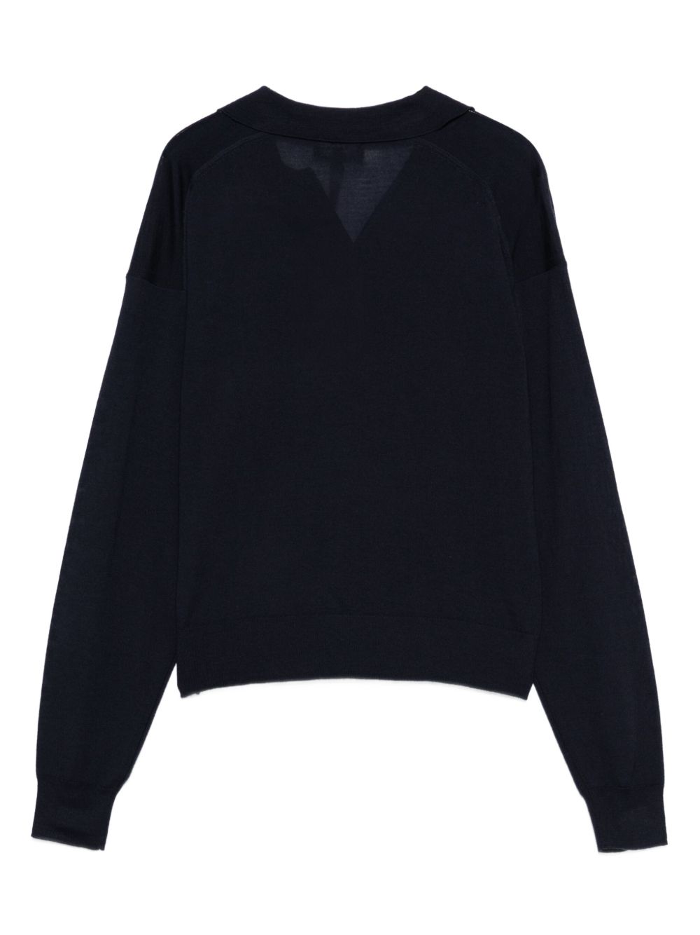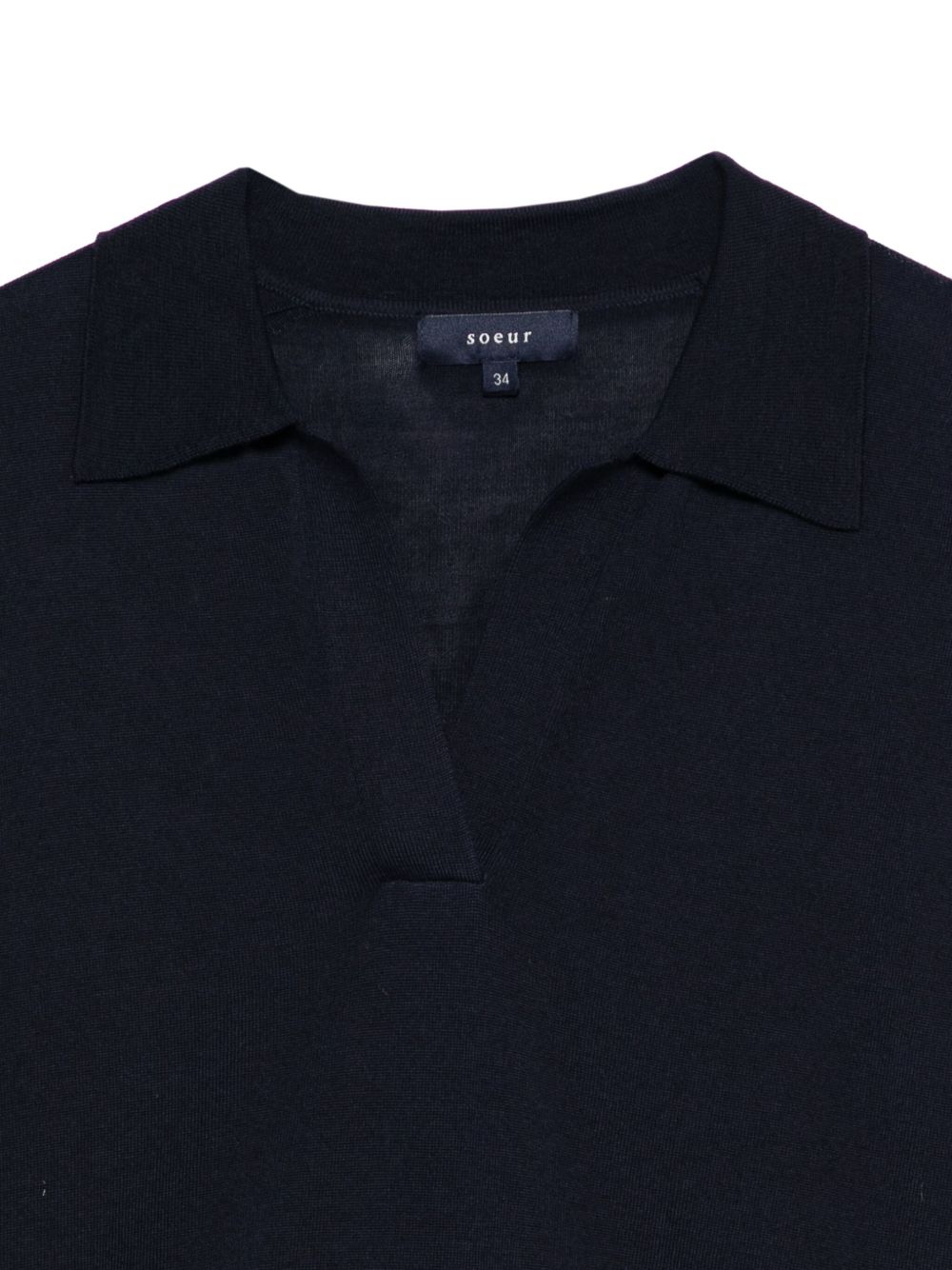 Pullover navy flaming di Soeur in lana con colletto polo, apertura senza bottone, polsini e orlo a coste.
