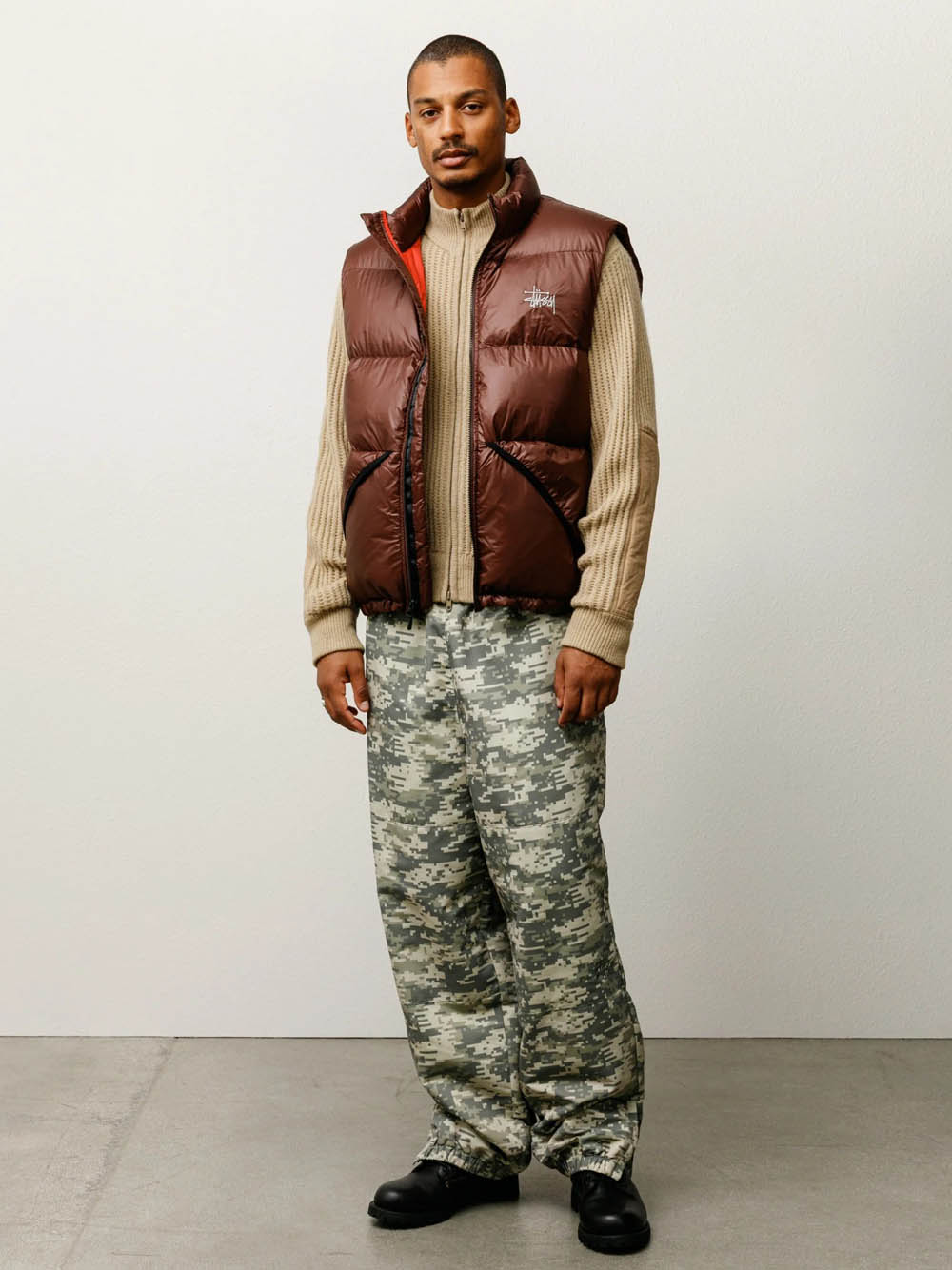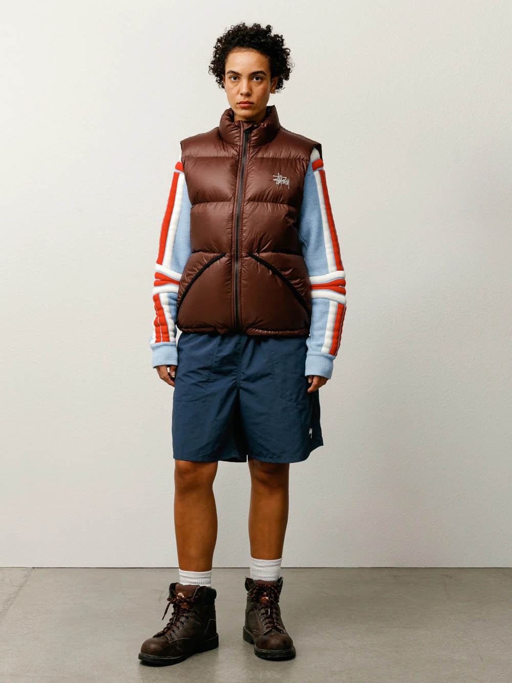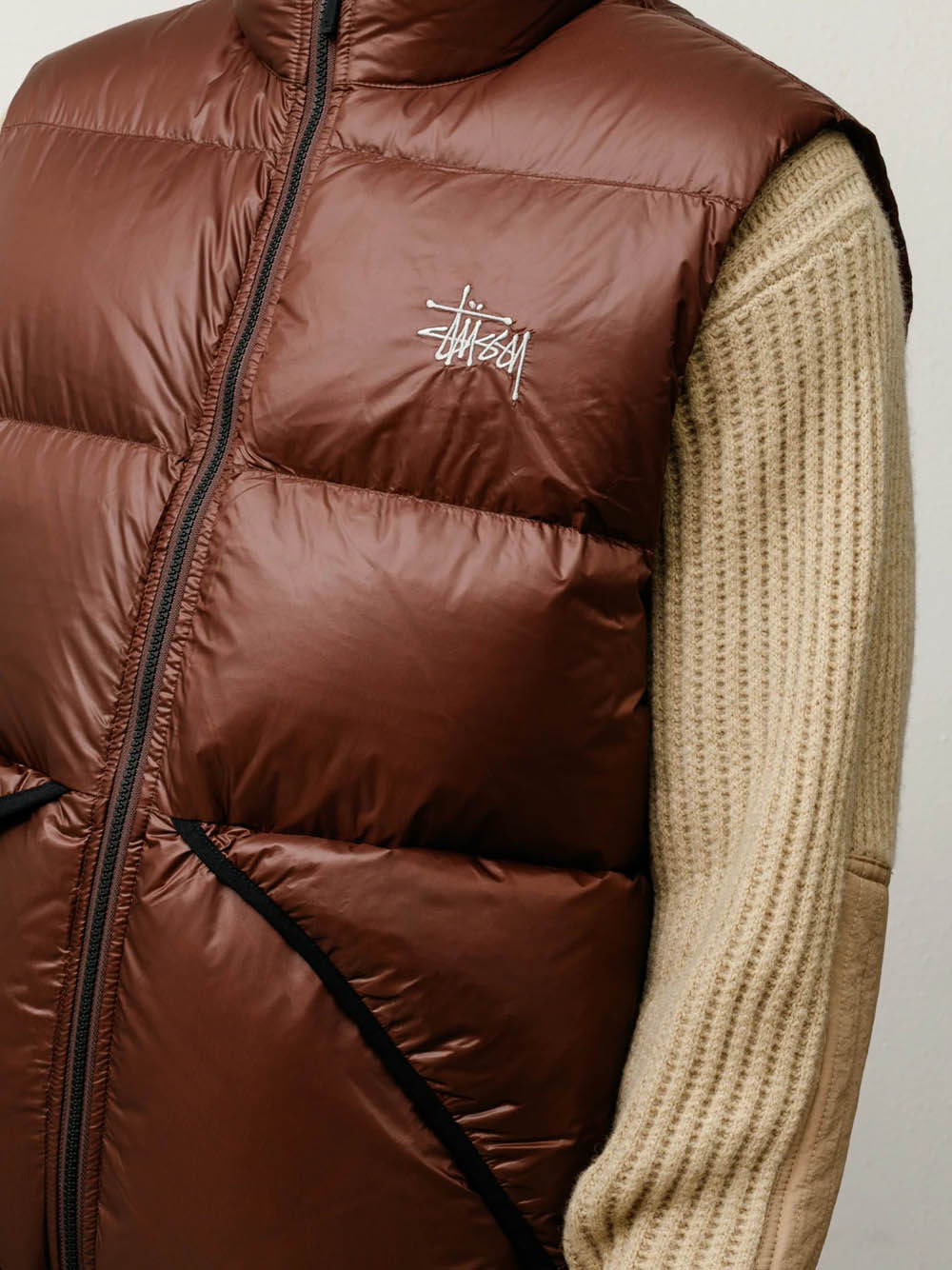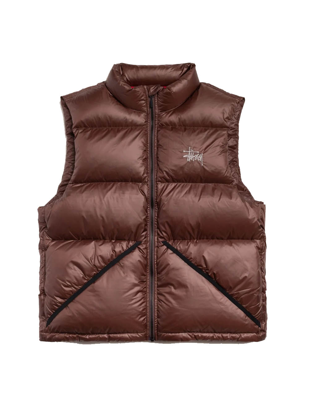 Gilet imbottito dal taglio classico con collo alto in nylon micro ripstop, imbottitura in piuma trapuntata 800 fill, chiusura con zip YKK in metallo, logo Stüssy basic ricamato sul petto, tasche con bordi in lycra e chiusura con zip nascosta, pattina antivento interna, tasca interna verticale con zip, tasche interne in rete.