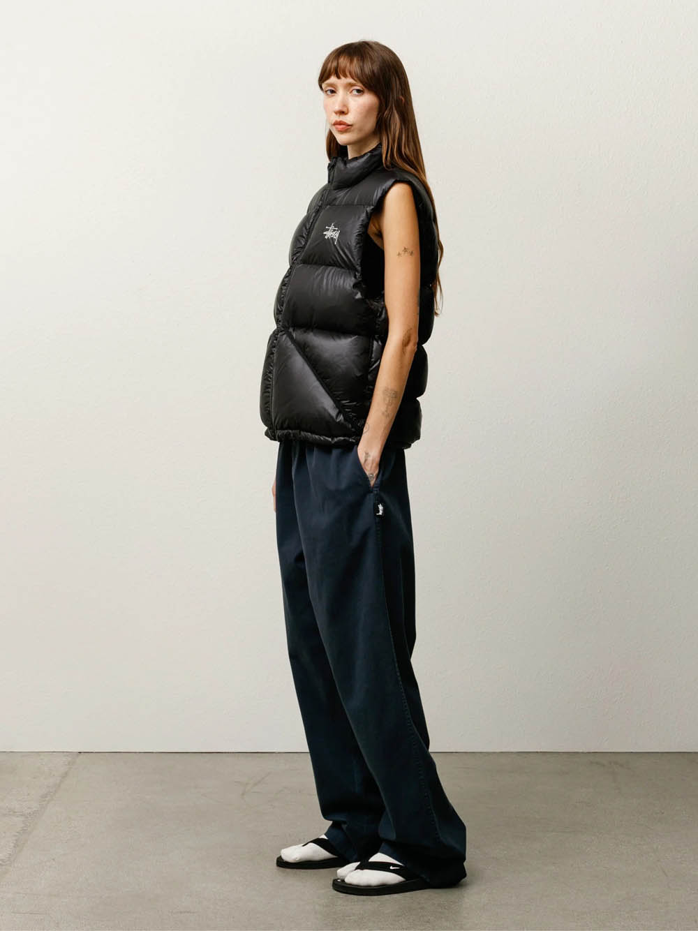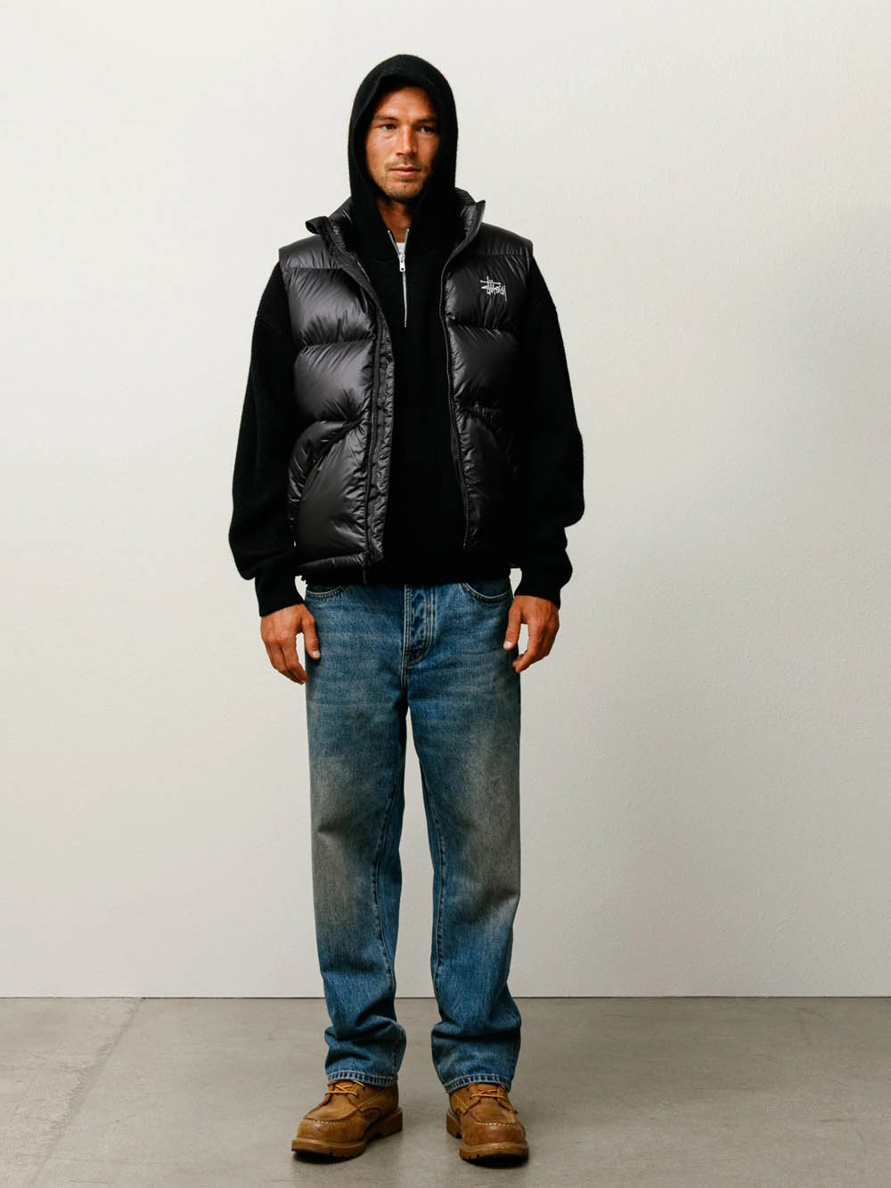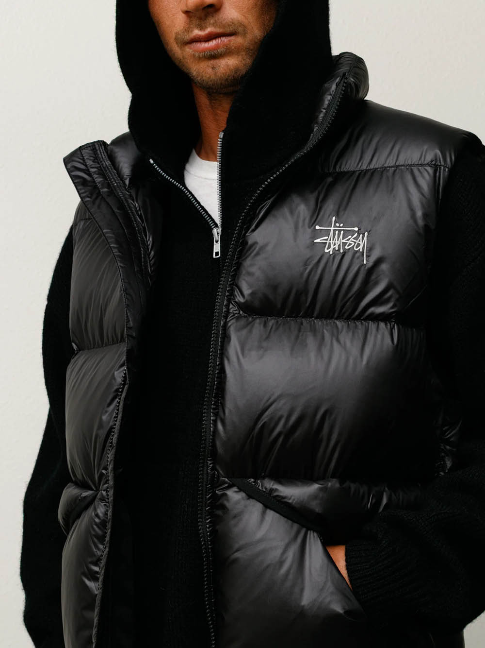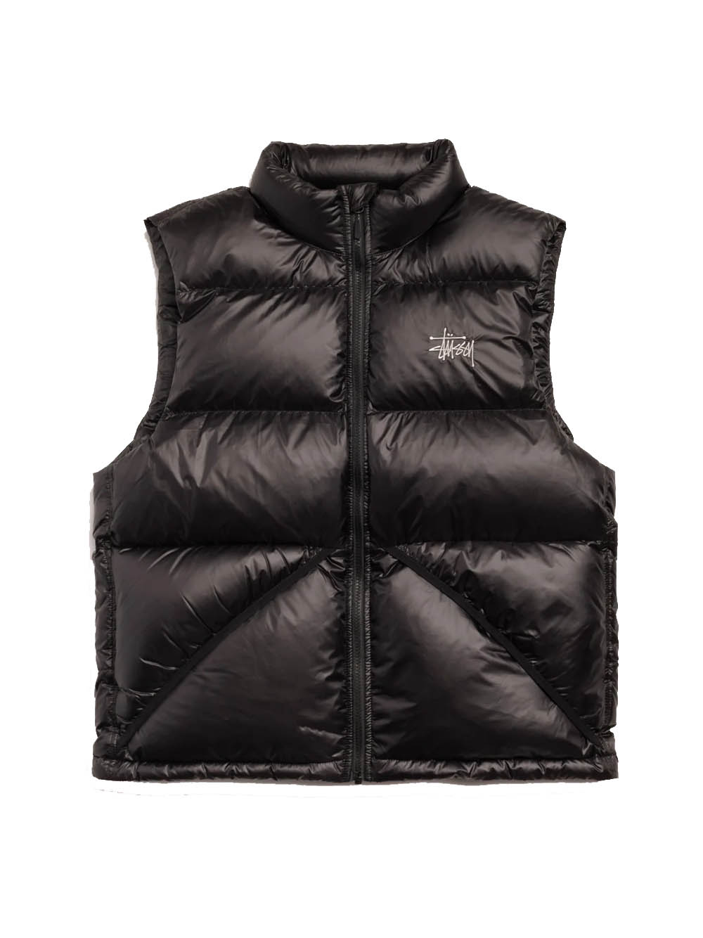 Gilet imbottito dal taglio classico con collo alto in nylon micro ripstop, imbottitura in piuma trapuntata 800 fill, chiusura con zip YKK in metallo, logo Stüssy basic ricamato sul petto, tasche con bordi in lycra e chiusura con zip nascosta, pattina antivento interna, tasca interna verticale con zip, tasche interne in rete.