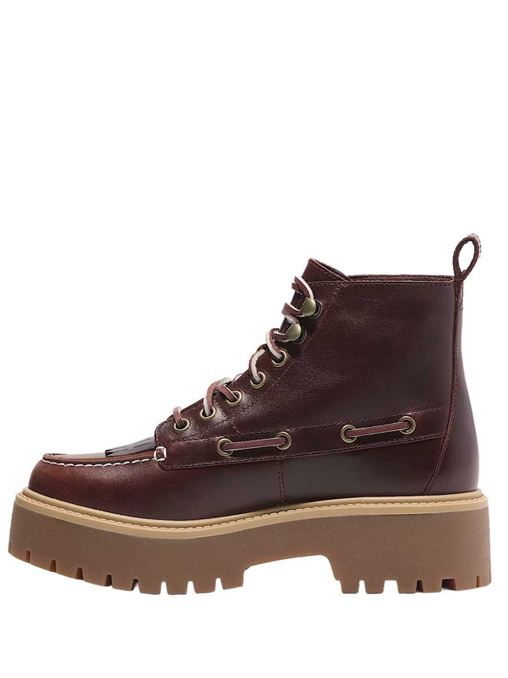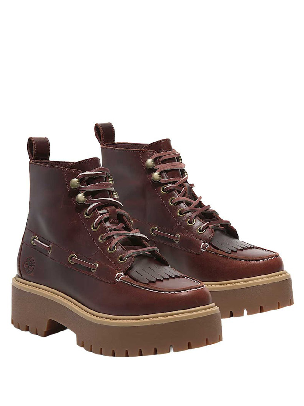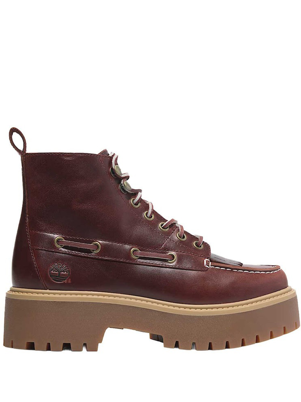 Stivali Stone Street Mid Rootbeer di Timberlad in pelle con logo laterale goffrato, punta tonda, chiusura frontale con lacci, chiusura laterale con lacci, soletta con logo e suola in gomma.