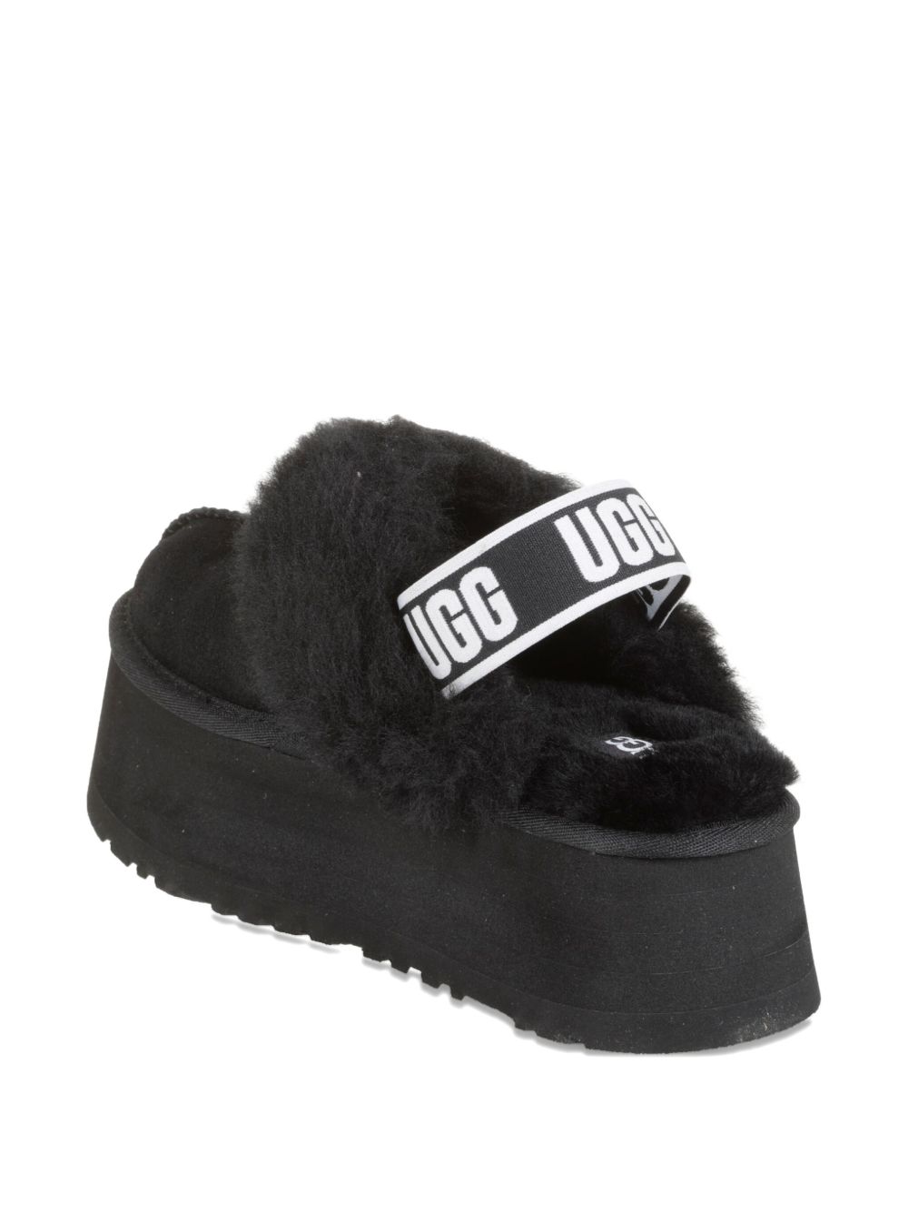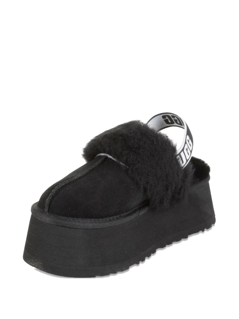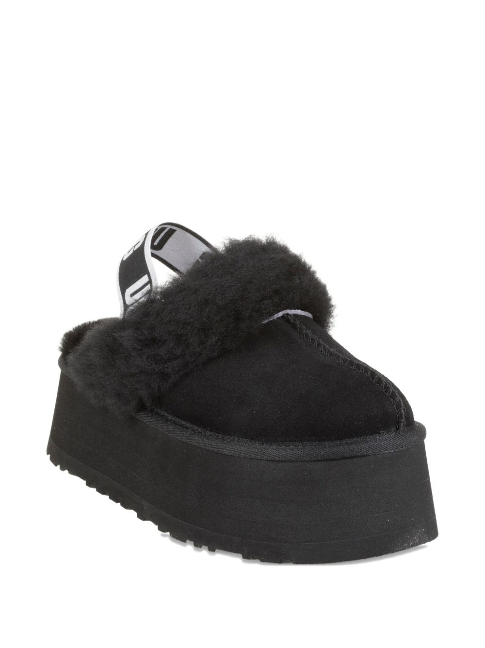 Mules neri Chestnut Funkette di Ugg in pelle scamosciata con suola platform, dettaglio in pelliccia e fascia elastica con logo posteriore.