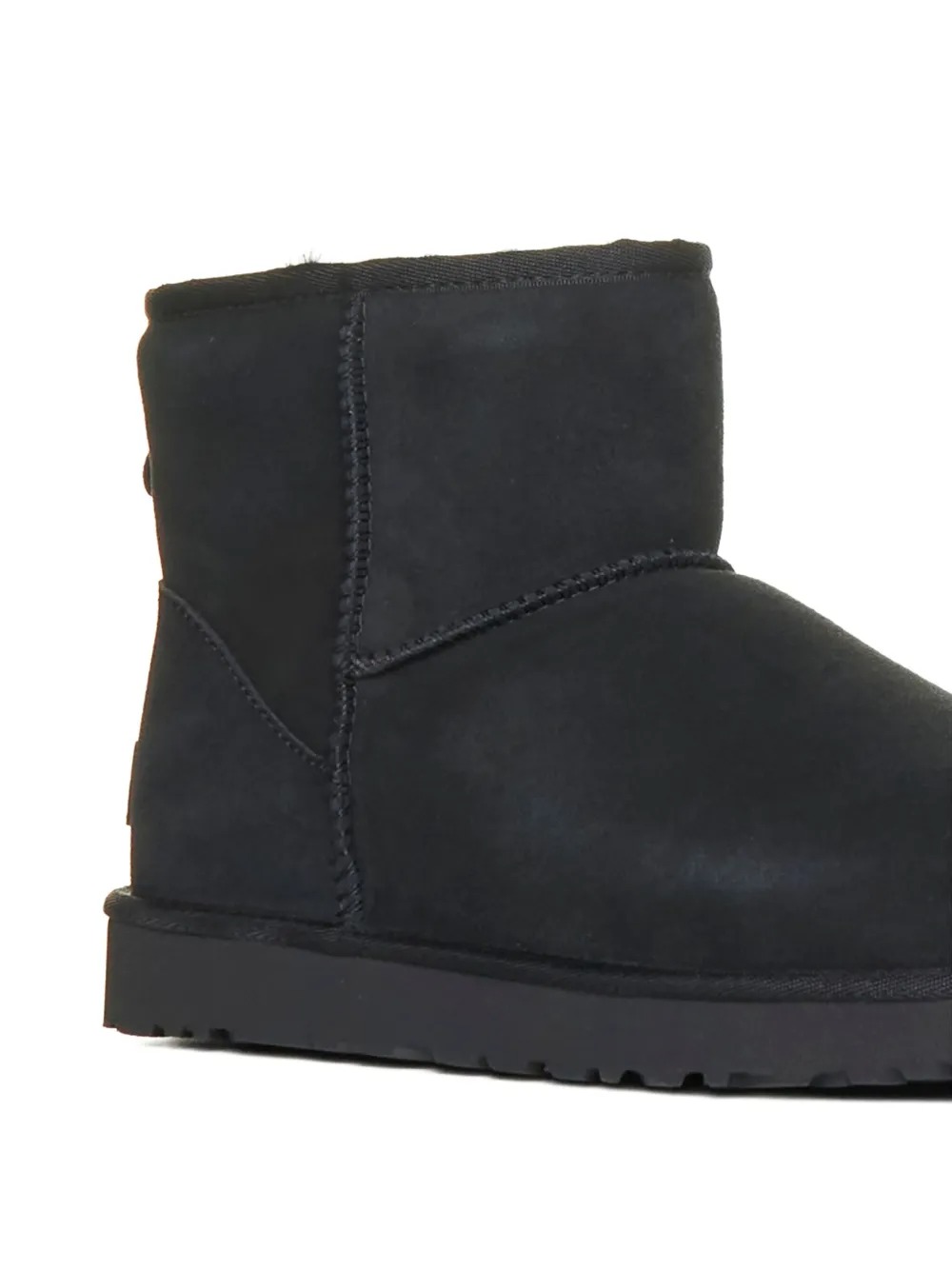 Stivali da donna neri Classic Mini II di Ugg in pelle con tomaia in montone rovesciato, soletta interna in lana, etichetta con logo sul tallone, imbottitura in pelliccia e suola piatta in gomma.