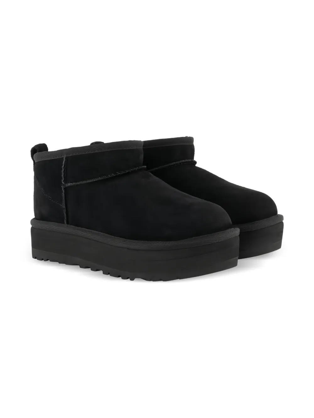 Stivali neri Classic Ultra Mini Platform di UGG in pelle con suola platform, imbottitura interna, cuciture tono su tono e altezza alla caviglia.